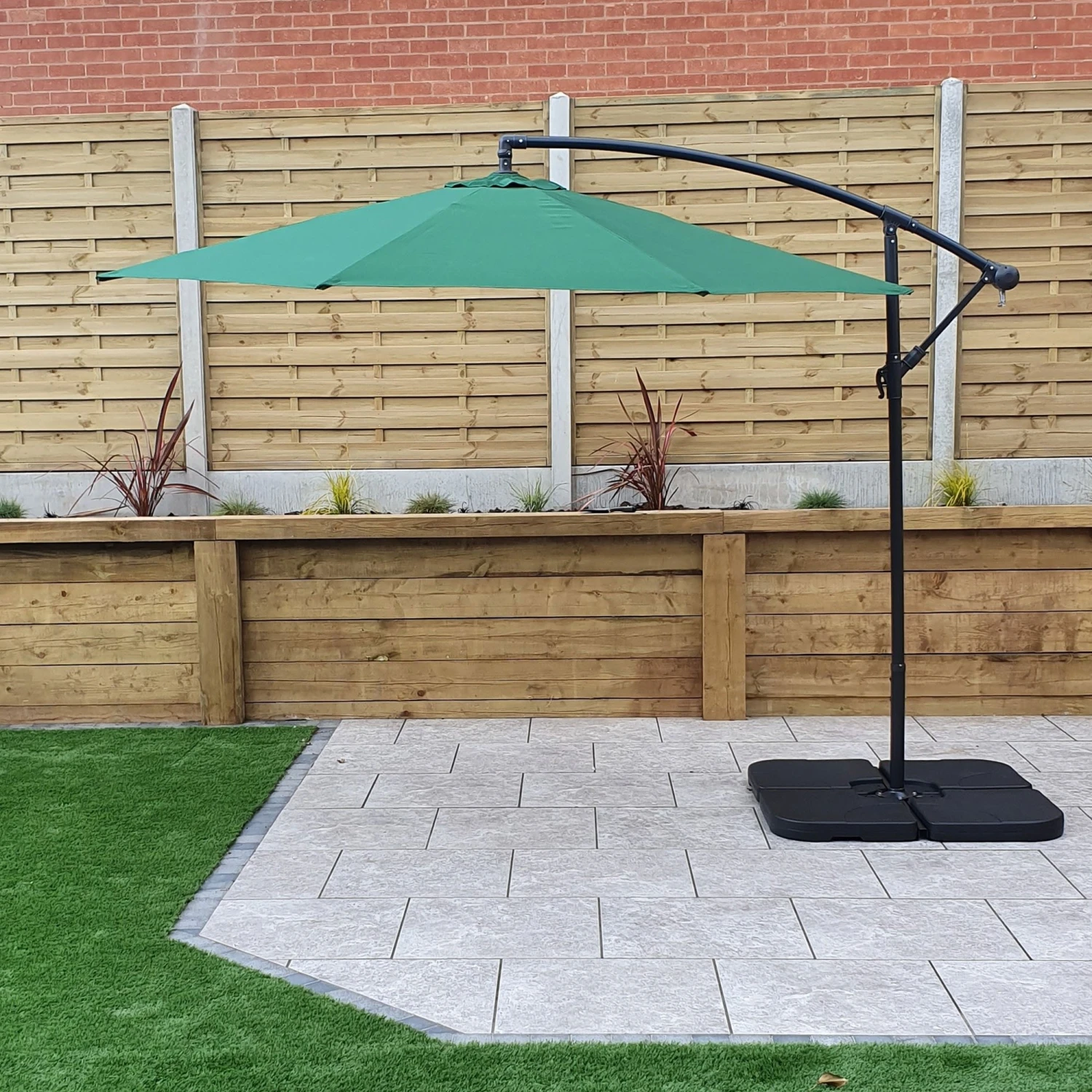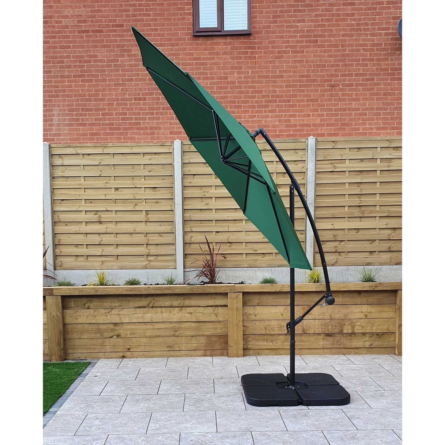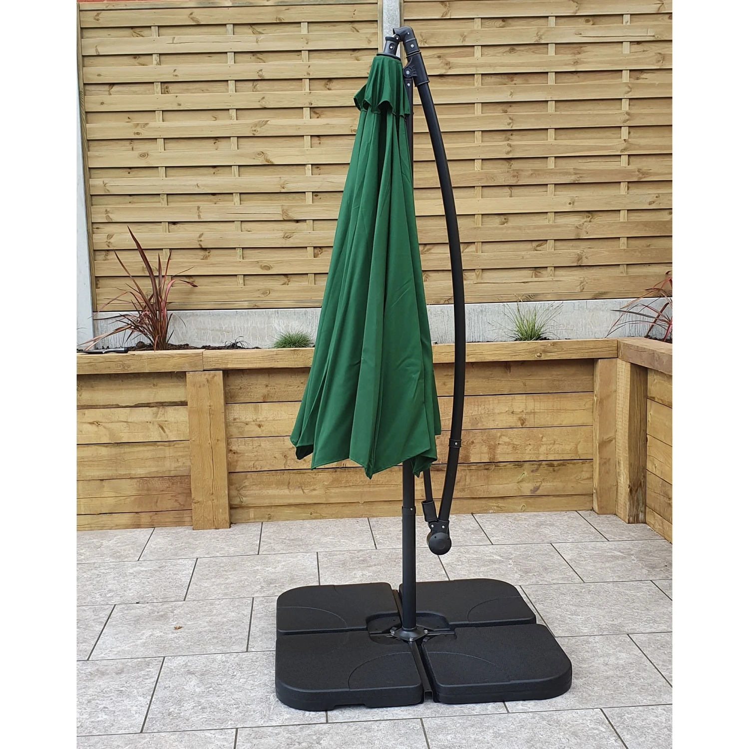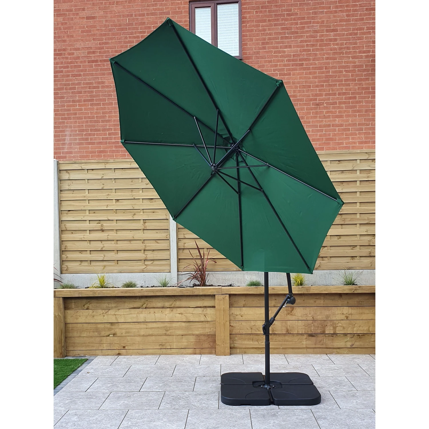 Add this 3m Green Canopy Banana Parasol to your garden to shade from the sunshine. This outdoor parasol spans 3 metres wide and is finished with a black frame with a stunning green canopy. This garden parasol is heavy-duty and is made with polyester to withstand all weather conditions including heavy rain and sun. The paroral is complete with a crank handle to easily raise and handle to wind up and down.