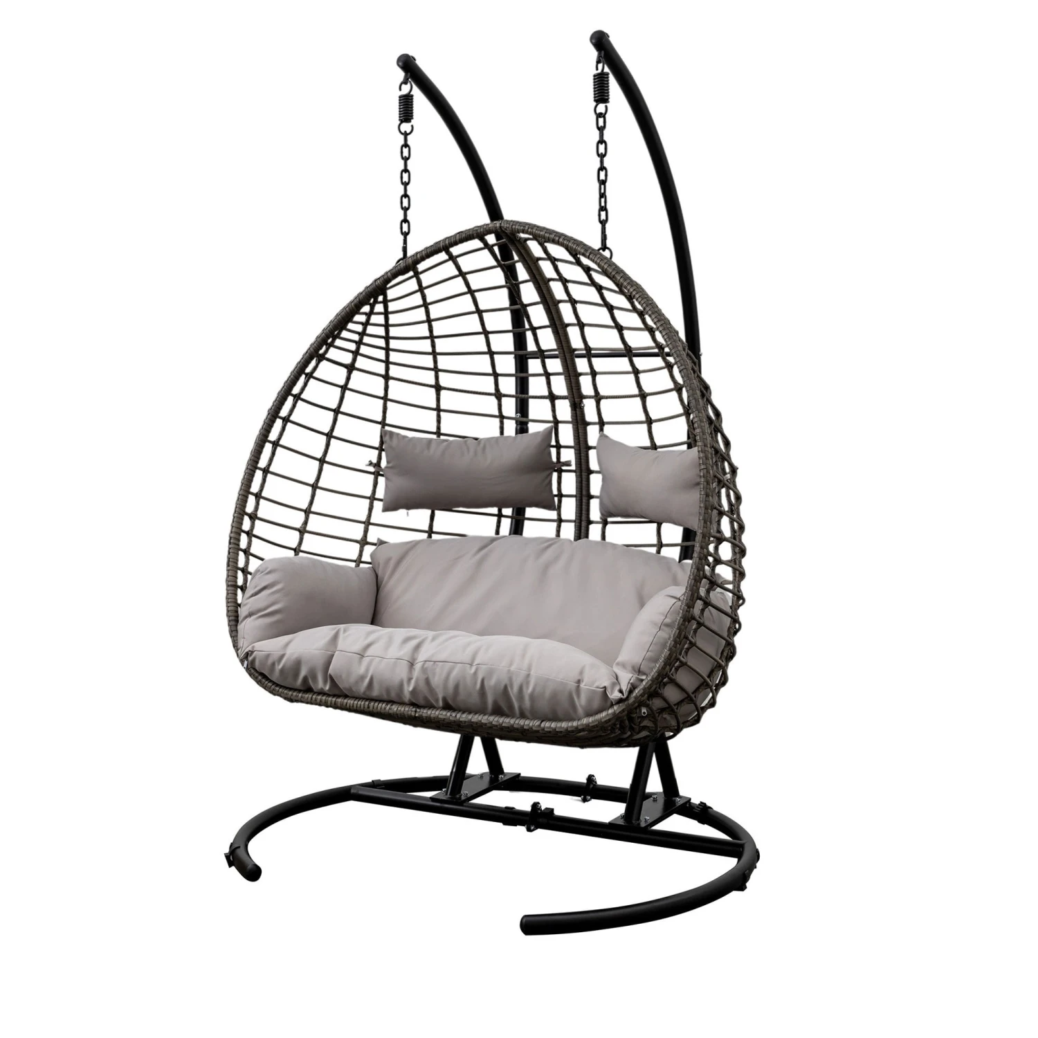 Adding luxury and style to your garden with this Adanero Natural Hanging 2 Seater Chair. Relax in this charming rattan style hanging chair. This 2 seater features grey showerproof cushions with 2 head rests attached to the egg shaped chair. This luxury chair is not just ideal for garden but balconies and poolside spaces or even as an indoor chair. During the winter months the chair can easily be dis-assembled
