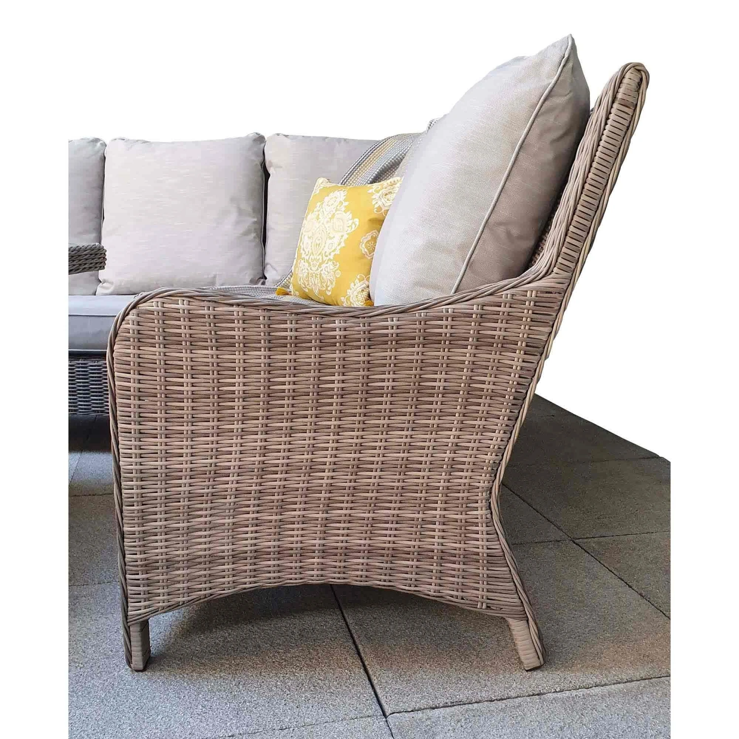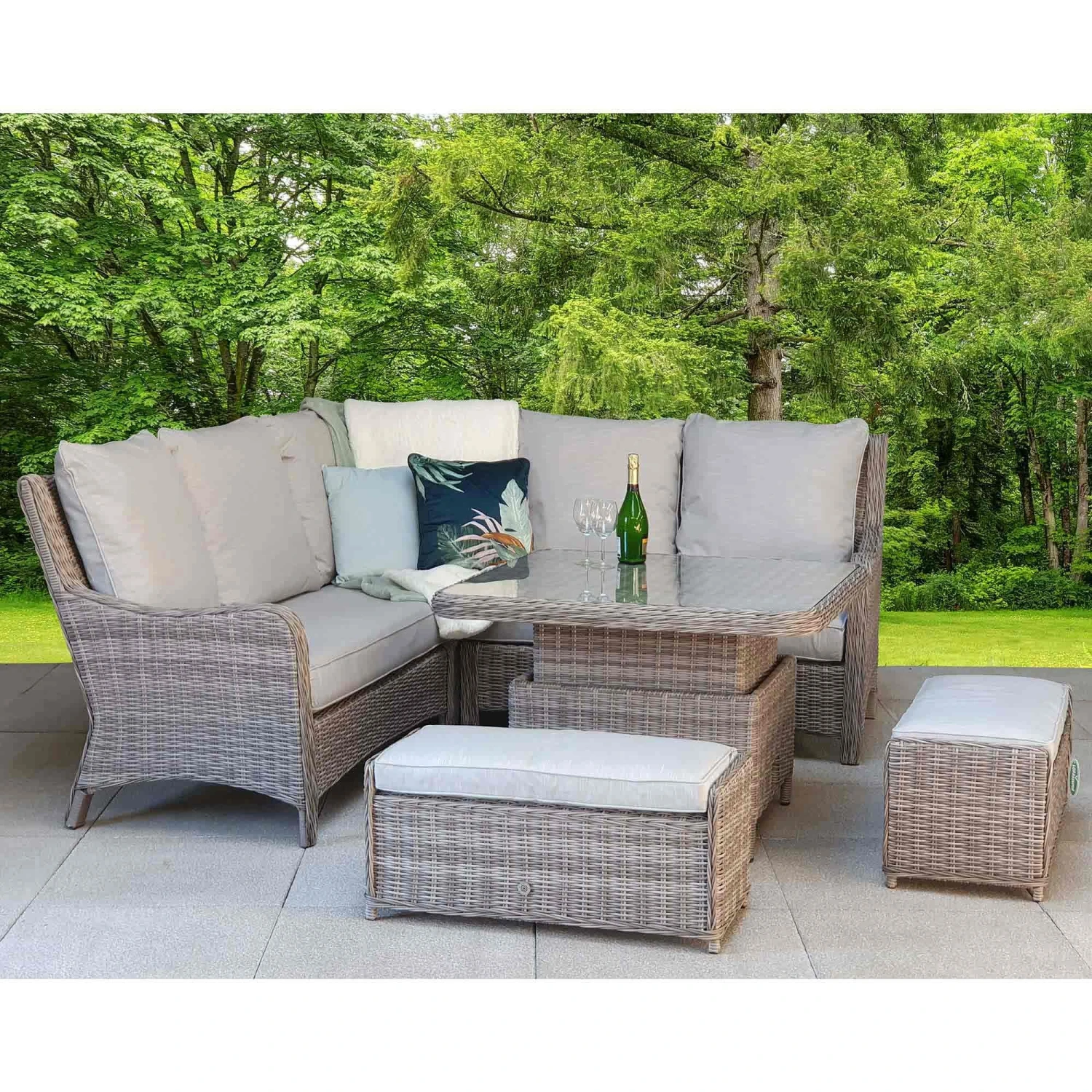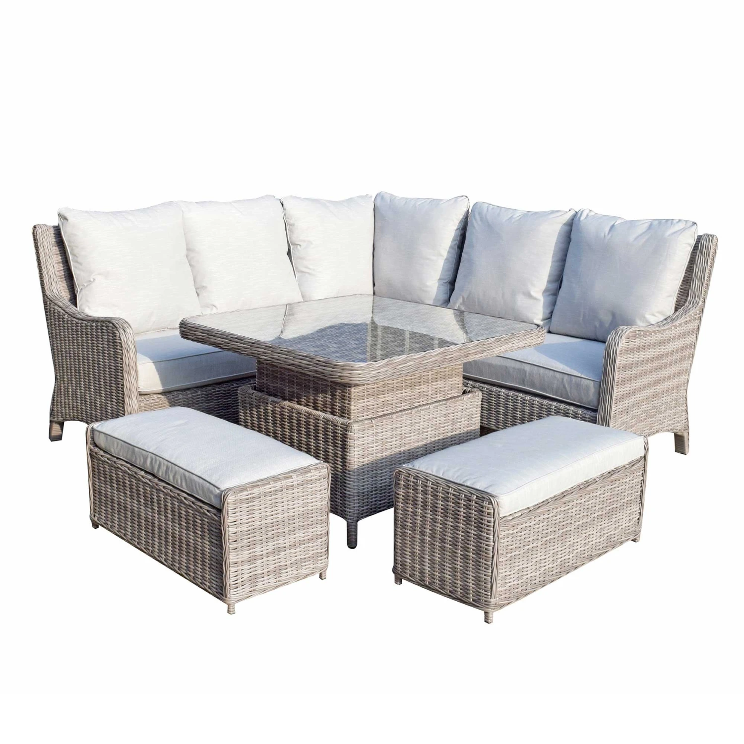This Alexandra Grey Rattan Corner Sofa Dining Set with Lift Table includes a corner sofa, two benches and a lift table! The lift table can be used as a coffee table or raised an extra 20cm instantly converting to a dining table! Suitable for all outdoor weathers, this outdoor dining set can be used for socialising, gatherings and parties! This rattan furniture set is made with UV treated rattan, powder coated aluminium frames and silver grey cushions are supplied with all seats.