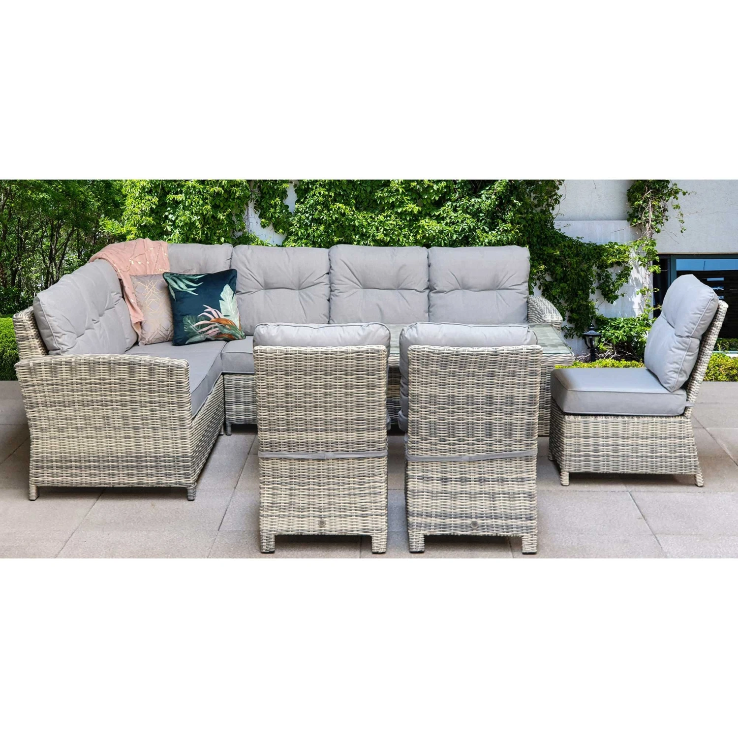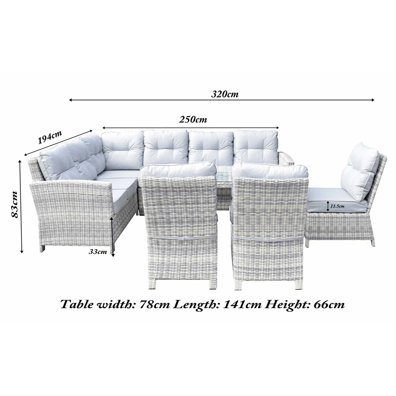 This Amy Grey Rattan Corner Sofa Dining Set with 3 Chairs is the ideal solution to your outdoor dining experience! Featuring a large and comfy corner sofa, three chairs and a table, this rattan furniture set is just what you need to enjoy meals outdoors! All seats are supplied with pale grey cushions which compliments the grey rattan look. Made from UV treated rattan and powder coated aluminium frames suiting all weathers, plus a glass table top finish.