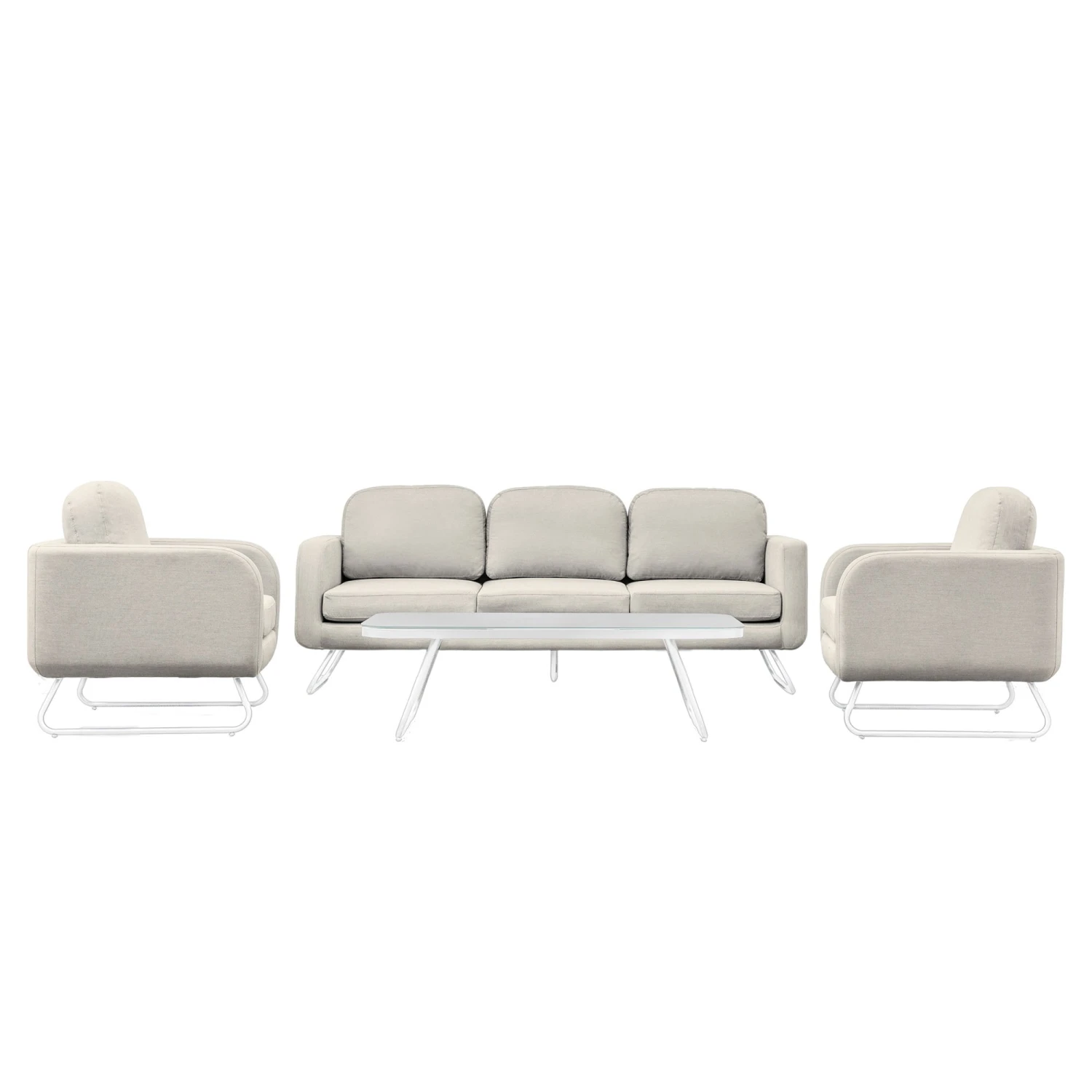 Bringing a touch of luxury to your garden or by your pool with this Ancona Linen 5 Seater Lounge Set in a stunning summer linen shade. The set features a 3-seater sofa, 2 chairs, coffee table and free covers for the seating. The products sit on aluminium white frames and feature upholstered in all-weather fabric with quick drying foam and resistant from fading, stains and mould. The rectangular shape coffee table has a glass top with a ceramic effect finish.