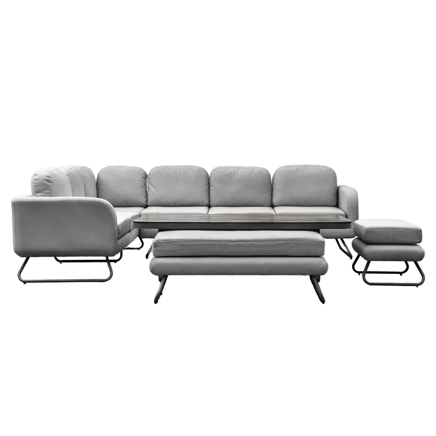 Add this luxury Ancona Slate Rectangle Dining Set Rising Table to your garden for relaxing and dining in the summer. The set come in a stunning slate grey colour with black trimmings. The sofa, benches and stool are covered in all-weather fabric for quick drying, which is resistant from fading, stains and mould. The table comes in a rectangular shape made from aluminium with a glass top and ceramic effect finish. The set also comes with free covers for the seating, to help keep them clean.Â