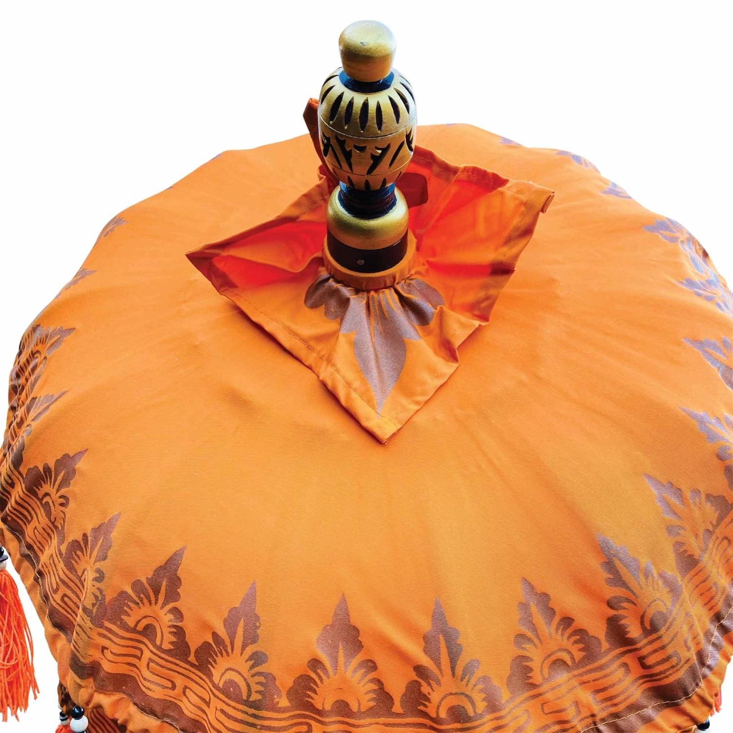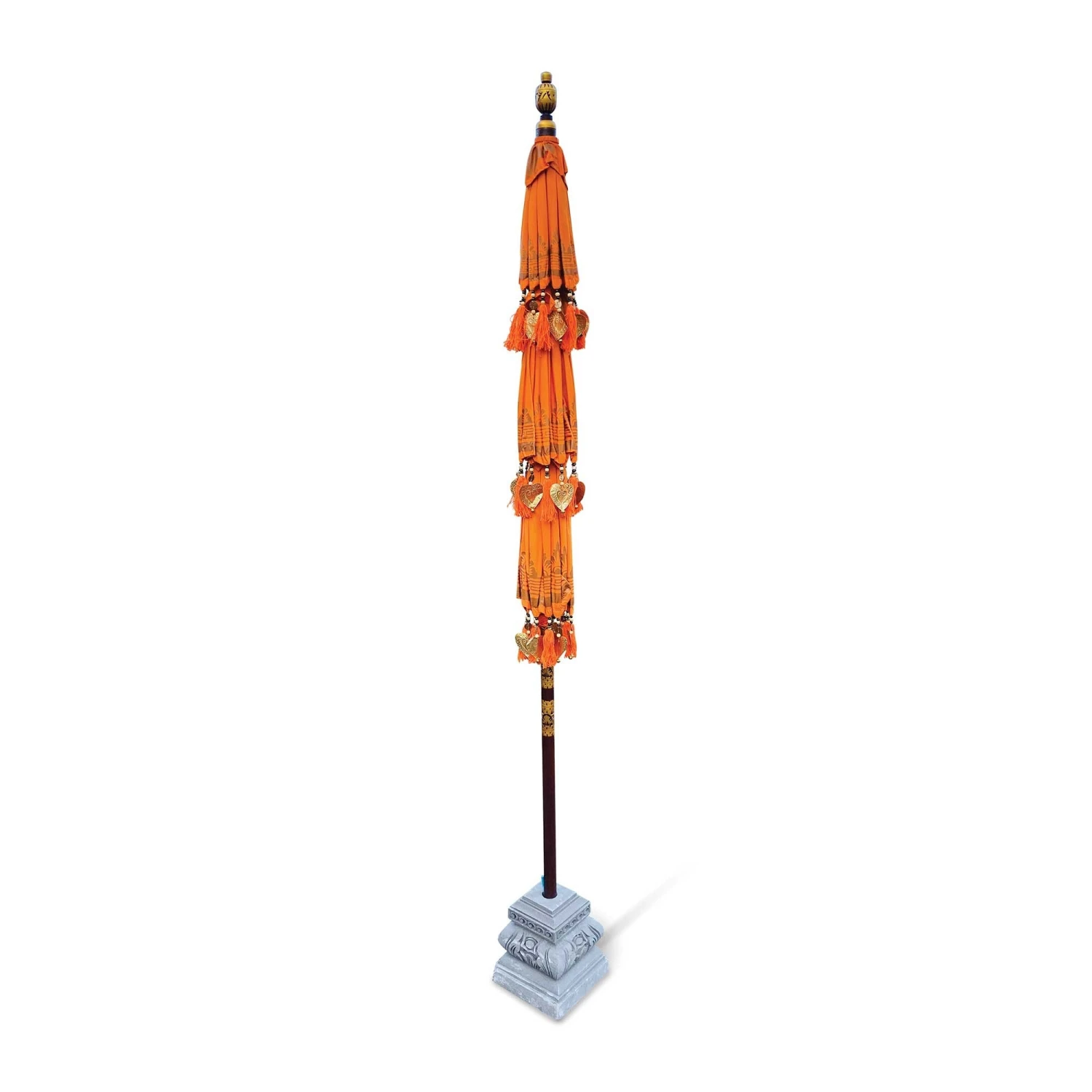 Introducing to you our stunning Bali Ceremonial Triple Parasol Orange & Gold, these beautiful parasols have been hand carved, hand printed and hand painted by a small family run business in Ubud, Bali. The authentic Balinese ceremonial parasol is perfect for adding a touch of colour in the garden or around the home, coming in vibrant colours with beading and fringing it is sure to create a wow factor. Â