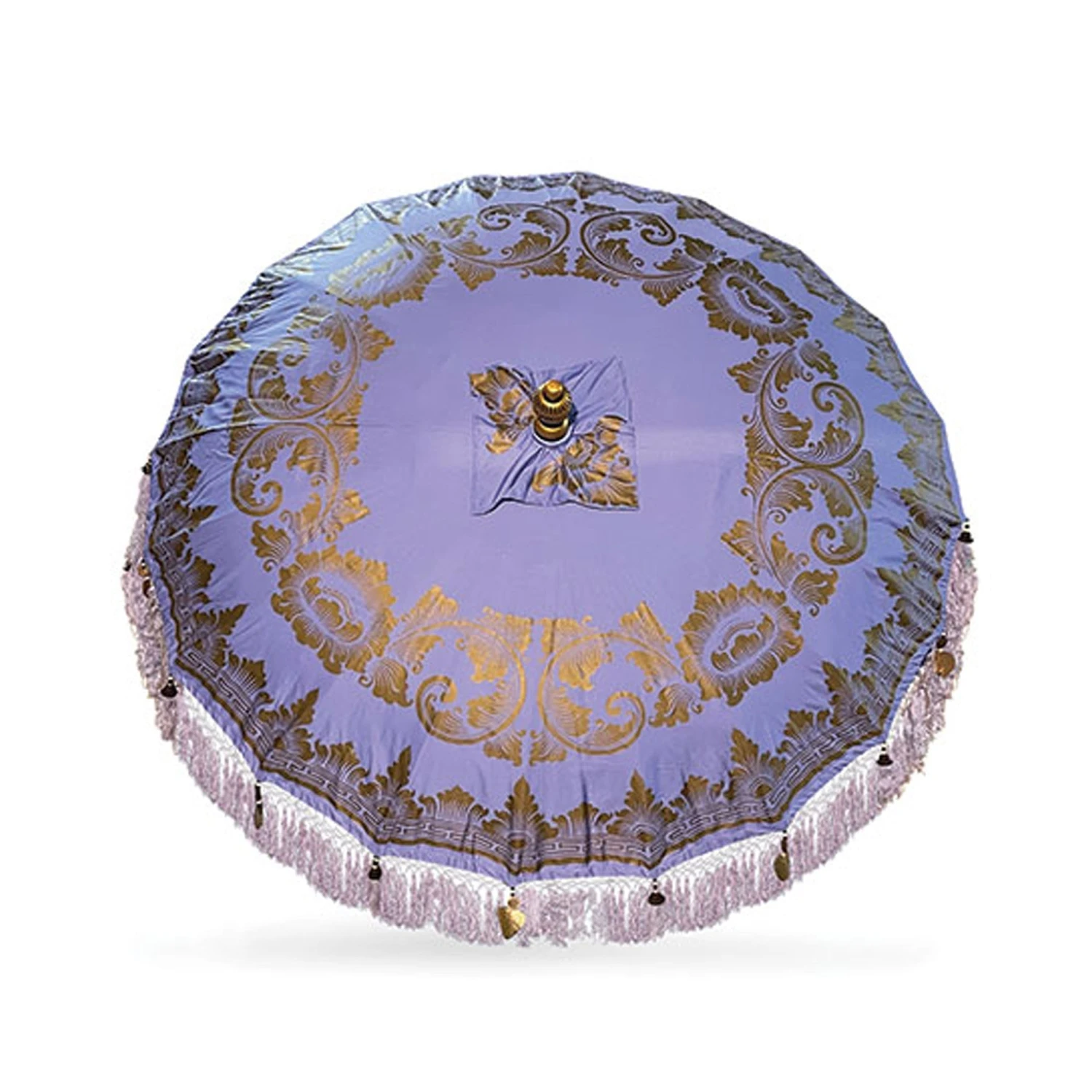 Complete your garden set up when you introduce this Bali Large Sun Parasol Purple And Gold 2.5m (With Pole Joint) to your outdoor patio space. Handcrafted, woven and painted in Ubud Bali by a small family run business, it’s an impressive outdoor parasol that features authentic Balinese patterning in a beautiful purple and gold shade. Attached is a pole joint made from solid wood for a durable build, and it is finished off with tassel fringing around the outer edge. Base sold separately.