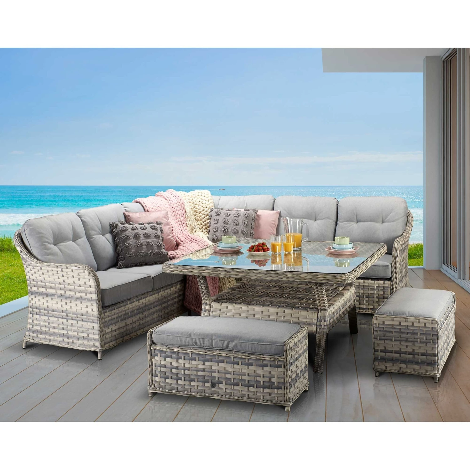 This Constance Silver Grey Rattan Corner Sofa Dining Set is fantastic for families and gatherings of all sizes! Ideal for the garden, patio or any other outdoor space, this rattan furniture set includes a large corner sofa, two benches and a square table with a glass table top and shelf. The outdoor furniture set is finished in silver grey rattan and paired with pale grey cushions for a contemporary look. Made with powder coated aluminium frames and UV treated rattan to suit most weather conditions.