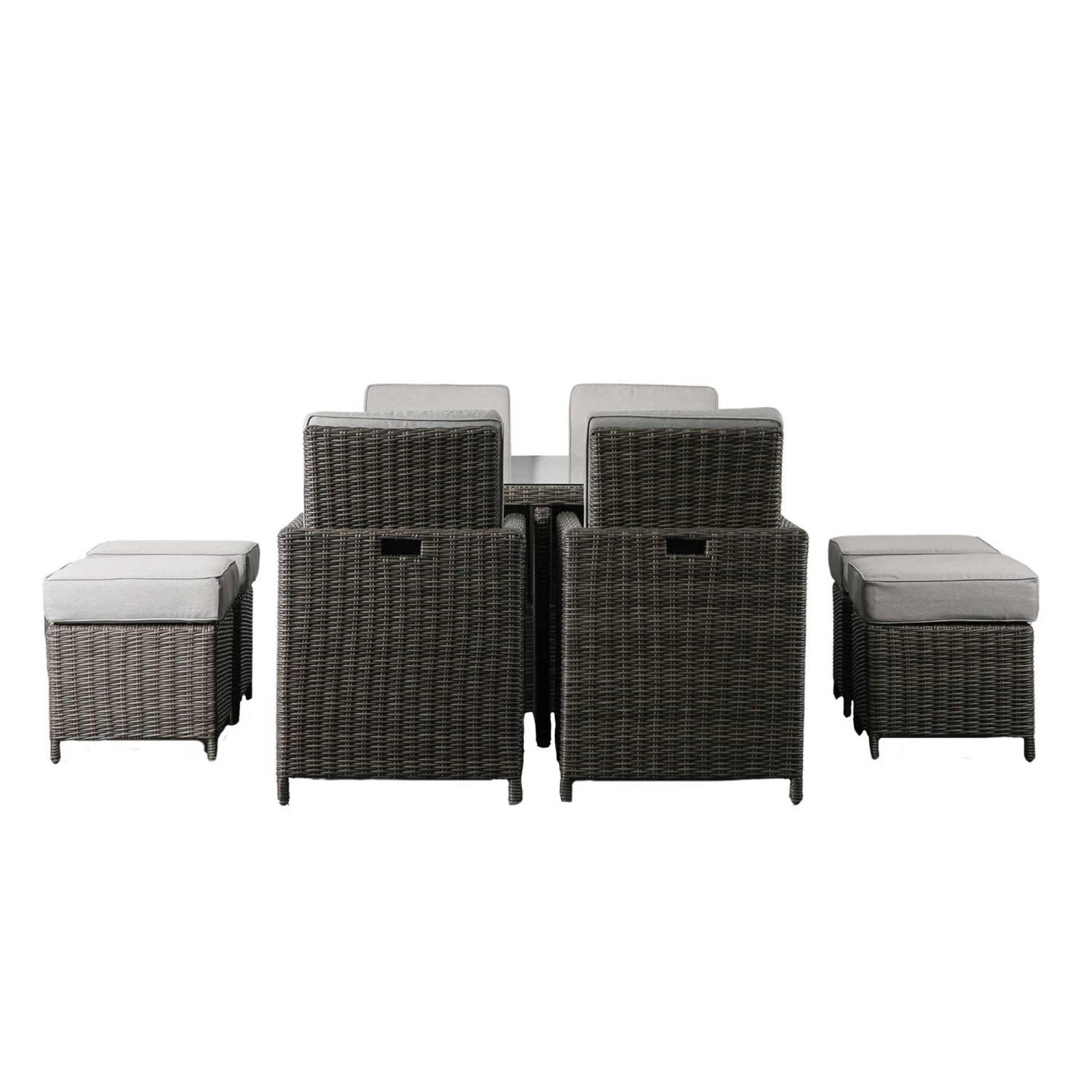 This Corse Grey Rattan 8 Seater Cube Dining Set is a great addition to any garden looking to host parties! This rattan furniture set features four dining chairs, four stools and a dining table, perfect for inviting friends and families to social gatherings! All items are crafted with a hand woven mixed half round/full round weave with a washed grey finish. This garden dining set can easily be stored away when not in use, with the backs of chairs folding down and neatly tucked under the table with the stools. The table top is finished with a tempered glass top and powder coated aluminium frame.