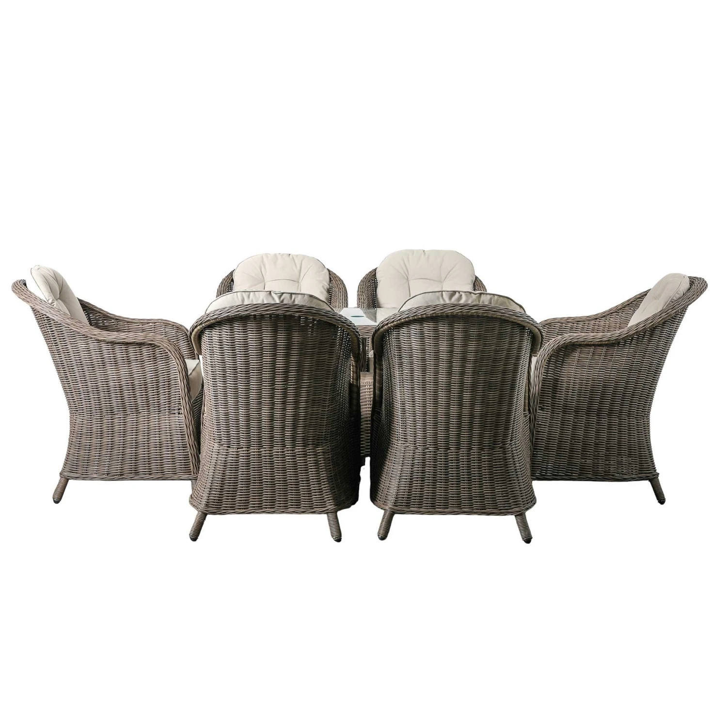 This lovely Corse Natural Rattan 6 Seater Oval Dining Set will greatly enhance any outdoor dining experience. Featuring a dining table and six coordinating dining chairs, this garden furniture set is crafted with 5mm PE rattan for weatherproof properties. The dining set is finished in a hand woven mixed half round/full round weave and natural colour tone, suiting any home exterior. The table is complete with a storage shelf and parasol hole, which can be used with a crank and tilt parasol. The table is topped with tempered glass and finished with a powder coated aluminium frame.