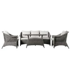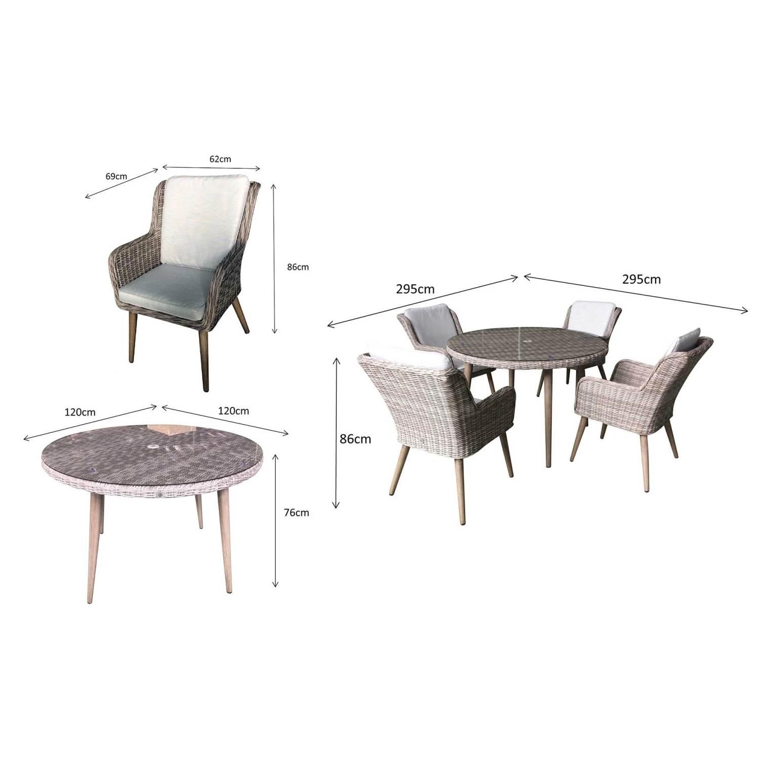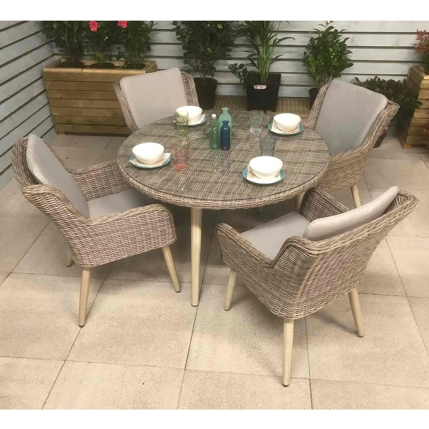 Make your neighbours full of garden envy with this Danielle Grey Rattan 4 Seater Round Dining Set! Including a round dining table and 4 chairs, this rattan furniture set is the ideal solution to enjoying warm weather, meals and drinks outdoors! The trendy looking outdoor set is finished in stunning grey rattan and complete with retro style legs for a unique touch! This set is made with UV treated rattan and powder coated aluminium frames, suitable for all weather conditions.