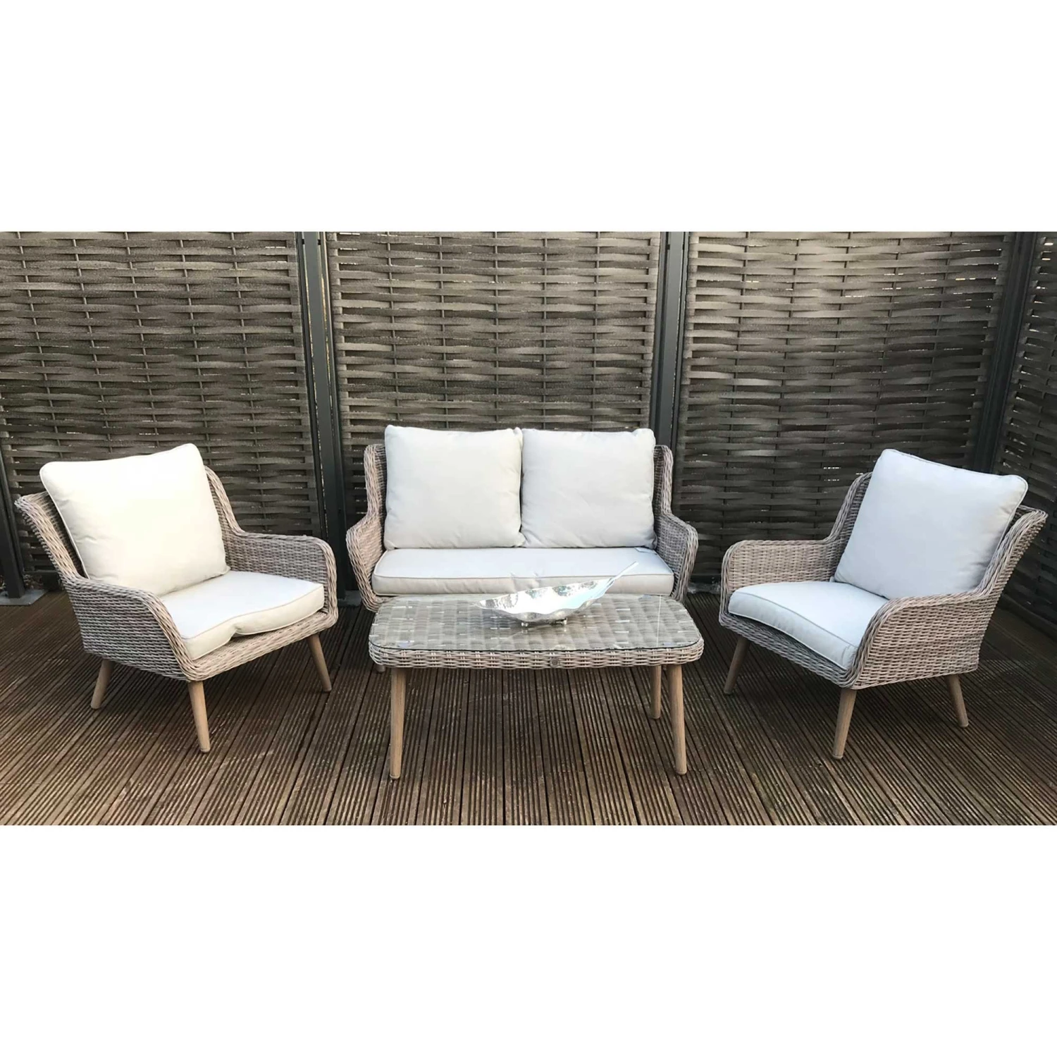This Danielle Grey Rattan 4 Seater Sofa Set is the ideal rattan furniture set for any garden! Seating up to 4 people, this set features a 2 seater sofa, two individual chairs and a table all with matching retro style legs. This lovely sofa set will bring charm and character to your outdoor space and the pale grey cushions will compliment the grey rattan as well as any garden greenery! Made with powder coated aluminium frames and UV treated rattan.
