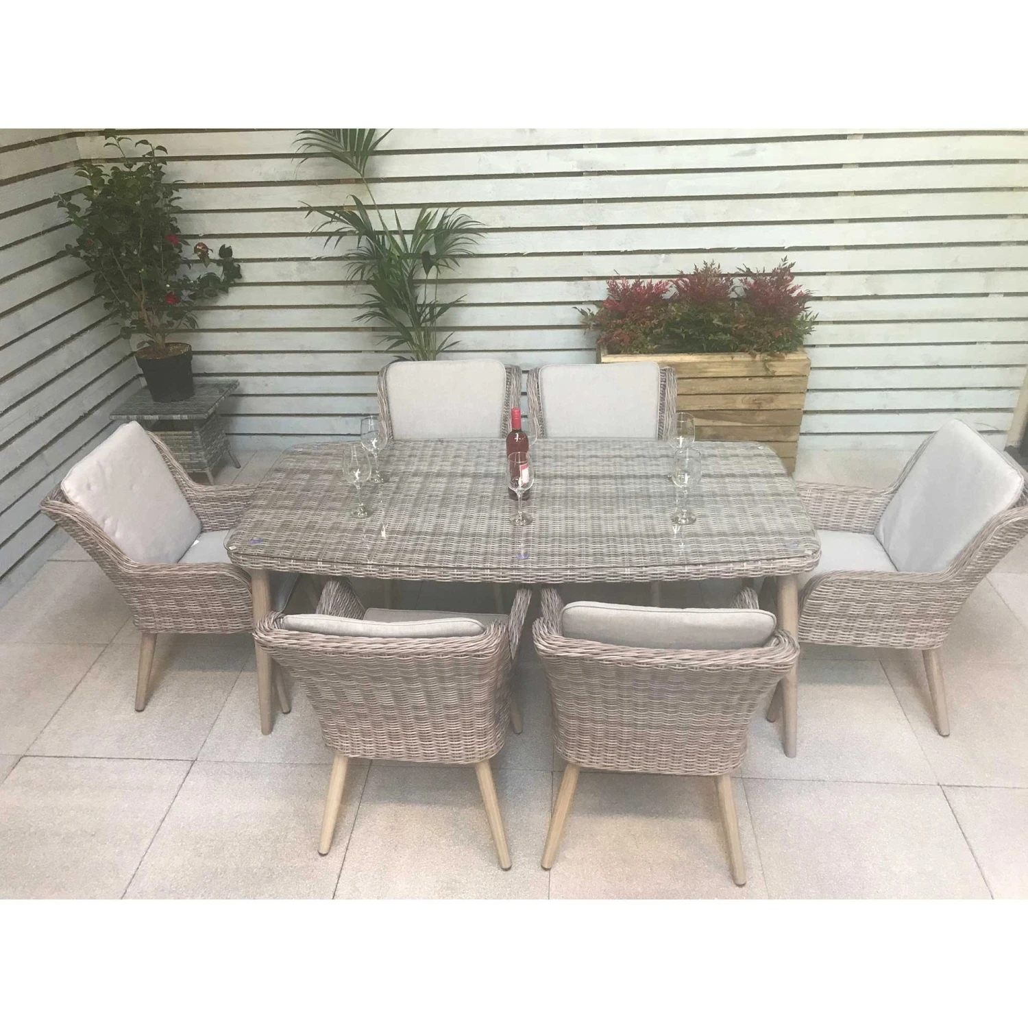 Enhance your outdoor dining experience with this Danielle Grey Rattan 6 Seater Rectangular Dining Set! Perfect for gatherings of up to 6 people, this outdoor dining set features a table and 6 chairs made from contemporary grey UV treated rattan and complete with matching retro style legs. This furniture set is made with powder coated aluminium frames for a strong and robust finish, withstanding all outdoor conditions.