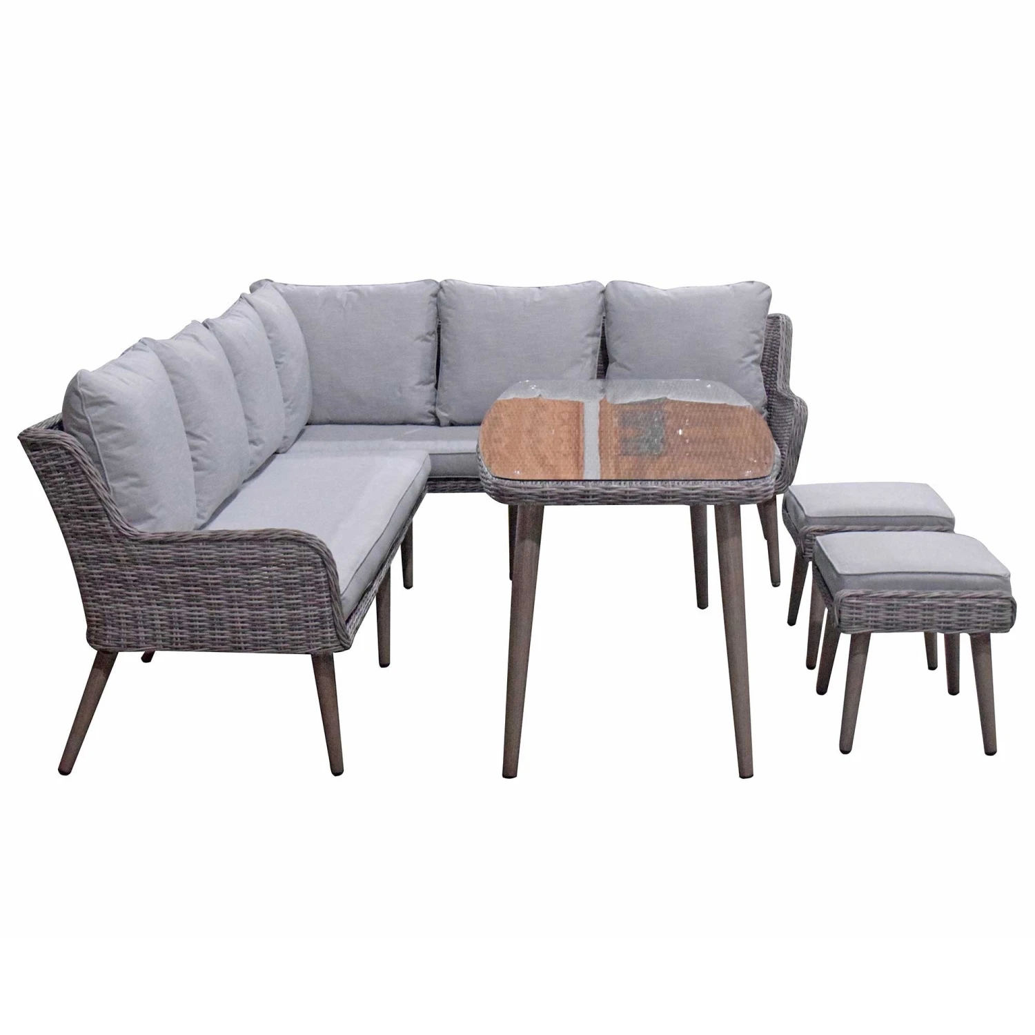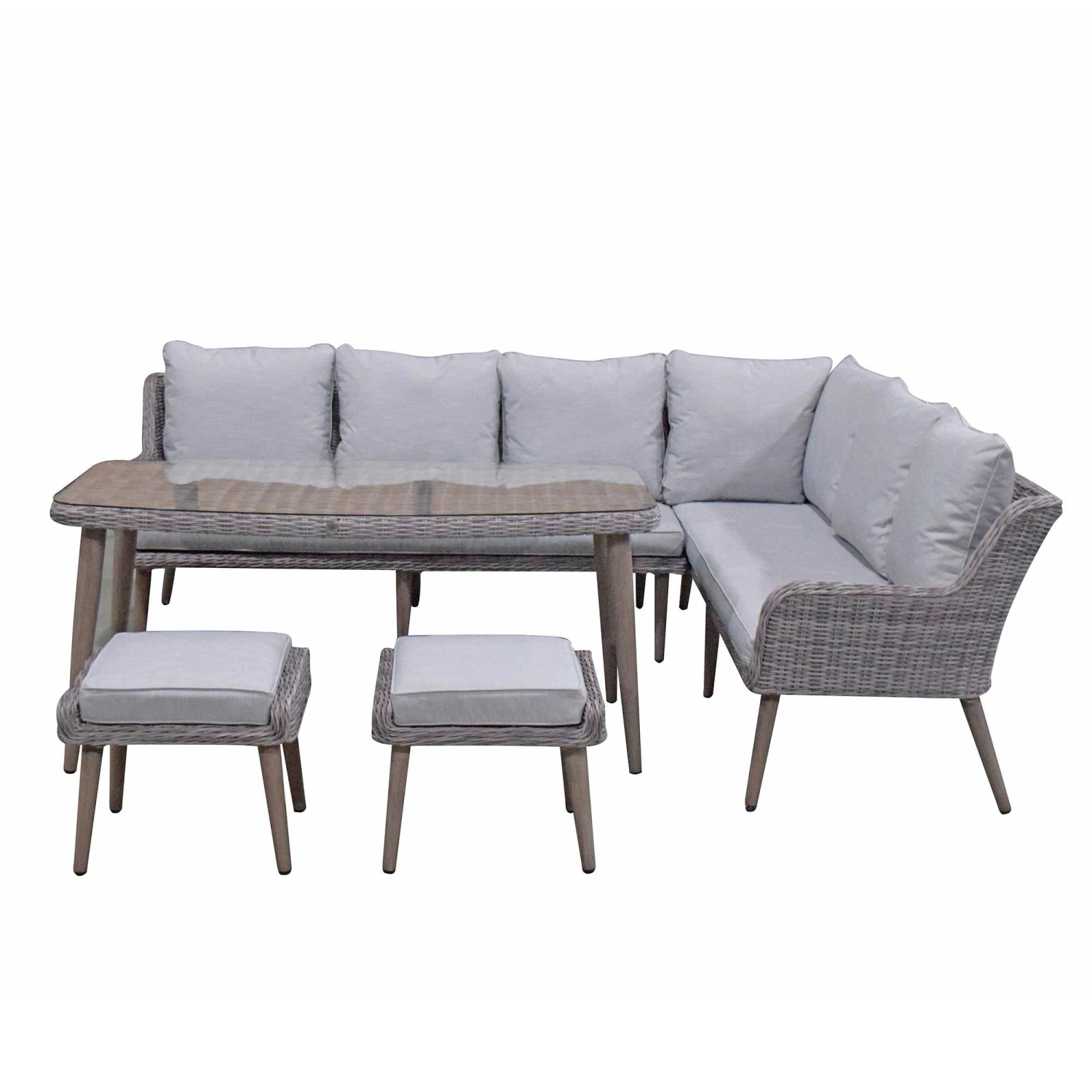 Great for socialising and dining outdoors, this Danielle Grey Rattan Corner Sofa Dining Set is perfect for any garden! Made from high quality UV treated rattan, this outdoor furniture set is finished in fine grey and complete with grey cushions. This corner sofa set will make the perfect addition in any garden corner, enabling friends and family to gather round nicely. Includes two ottomans and a glass top table. Ideal for all weather conditions.