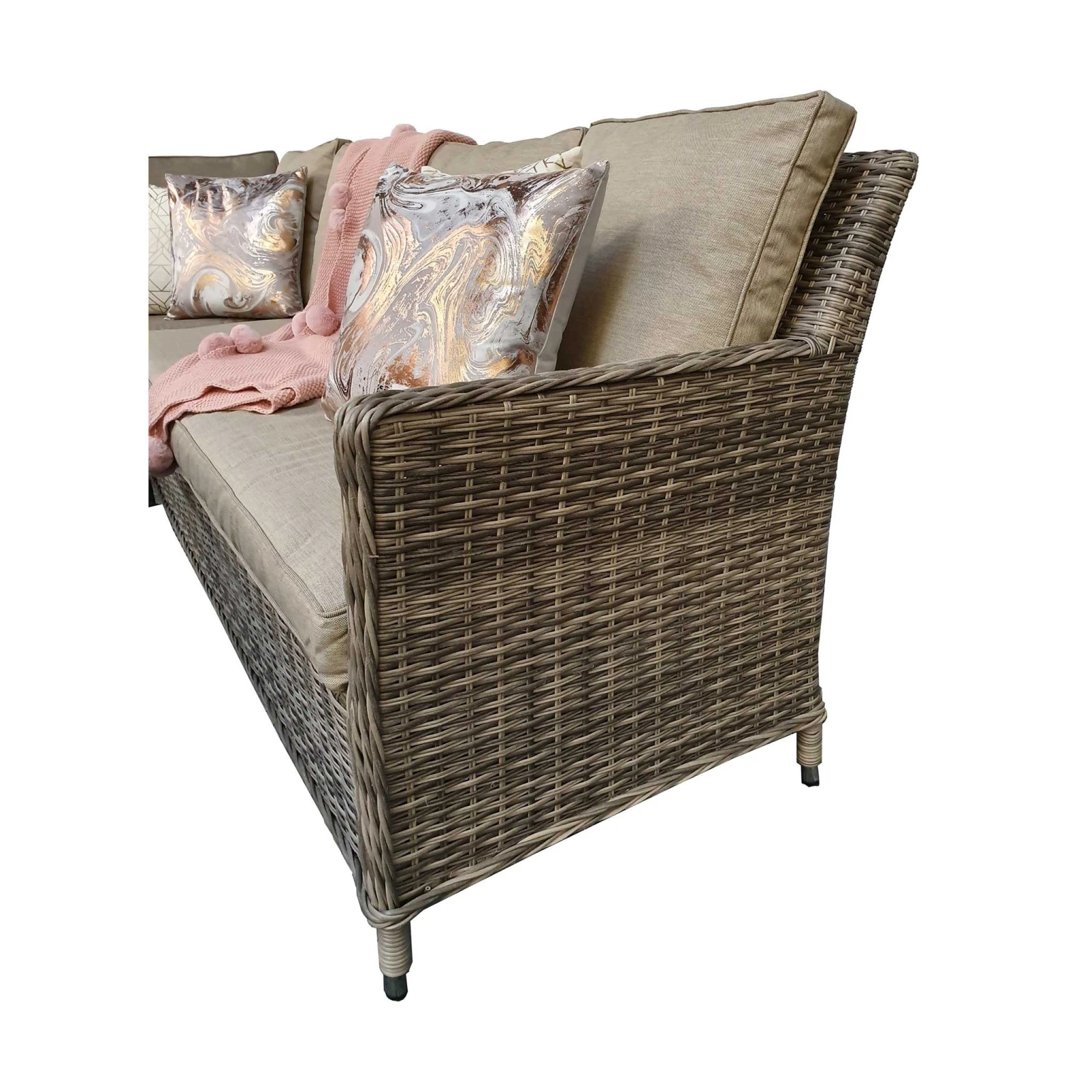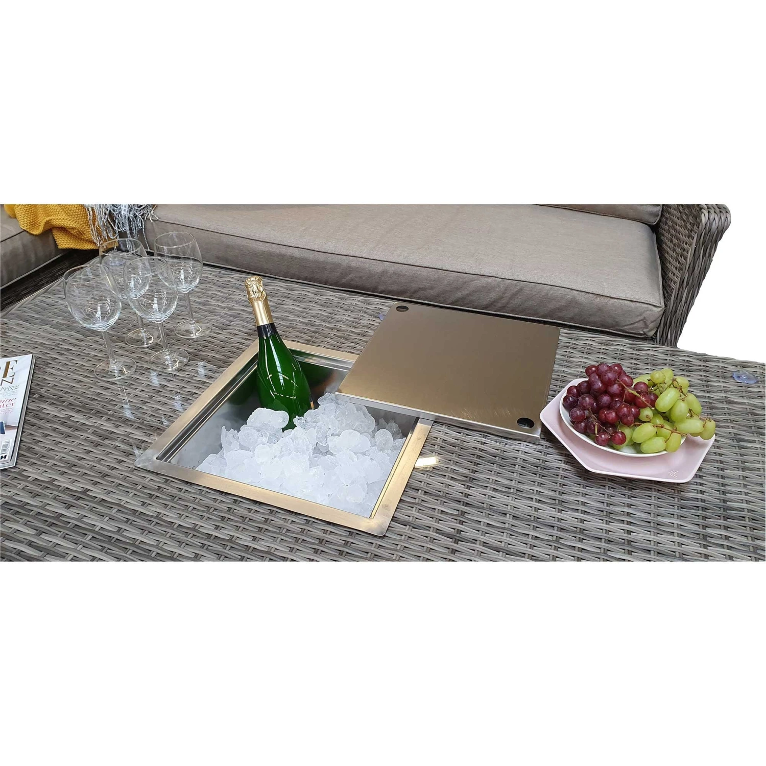 This Edwina Natural and Grey Rattan Corner Sofa Dining Set with Lift Table will complete any garden corner beautifully! Made with mixed natural and grey weave rattan, this corner sofa dining set includes three ottoman stools and a lift table as a centrepiece! The lift table features a handy ice bucket hole, ideal for keeping champagne cool! Made from UV treated rattan and powder coated aluminium frames to suit all weather types. Â