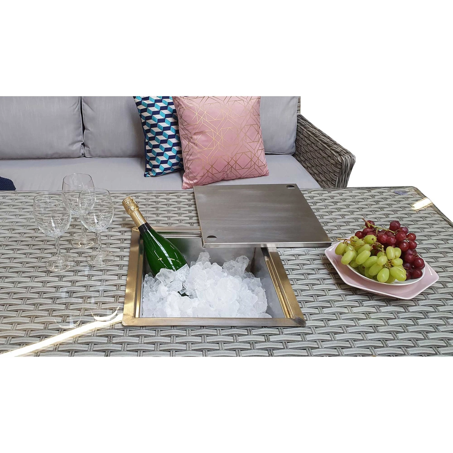 Add the finishing touch to your garden with this Edwina Special Grey Rattan Corner Sofa Dining Set with Lift Table! Ideal for seating friends and family, this outdoor furniture set is the ideal piece of furniture to complete your garden. This rattan set is made from UV treated rattan and powder coated aluminium frames to withstand all weather conditions. The main feature of this set is the lift table with a stunning ice bucket hole to keep drinks cool in hot weather!