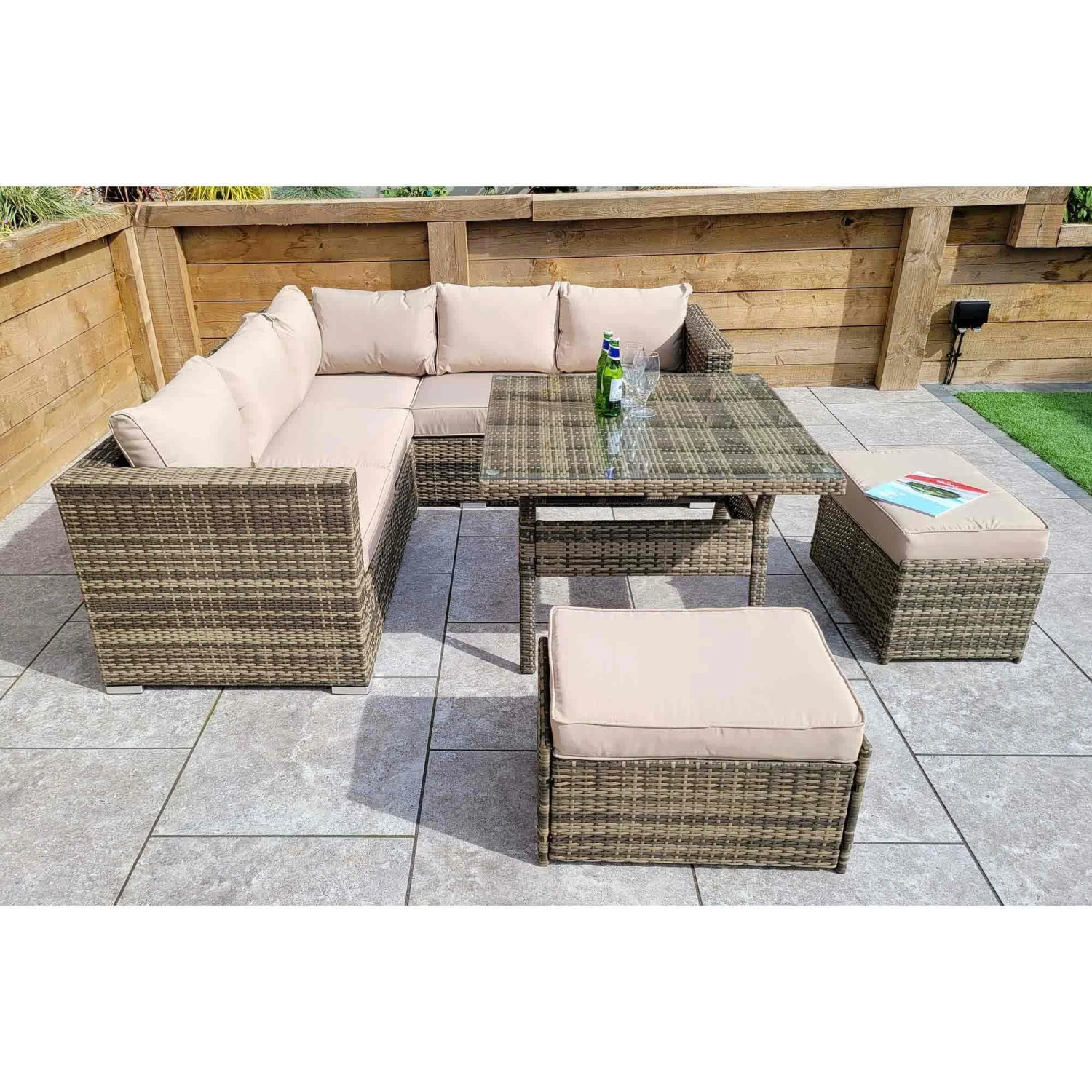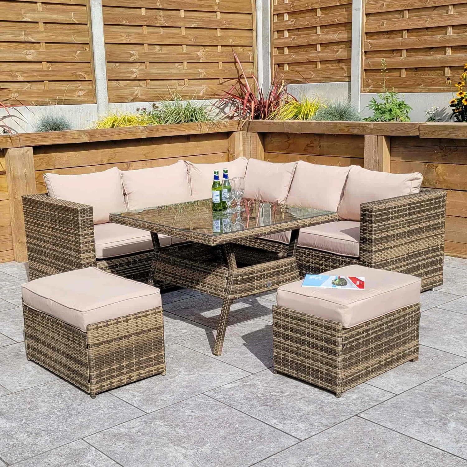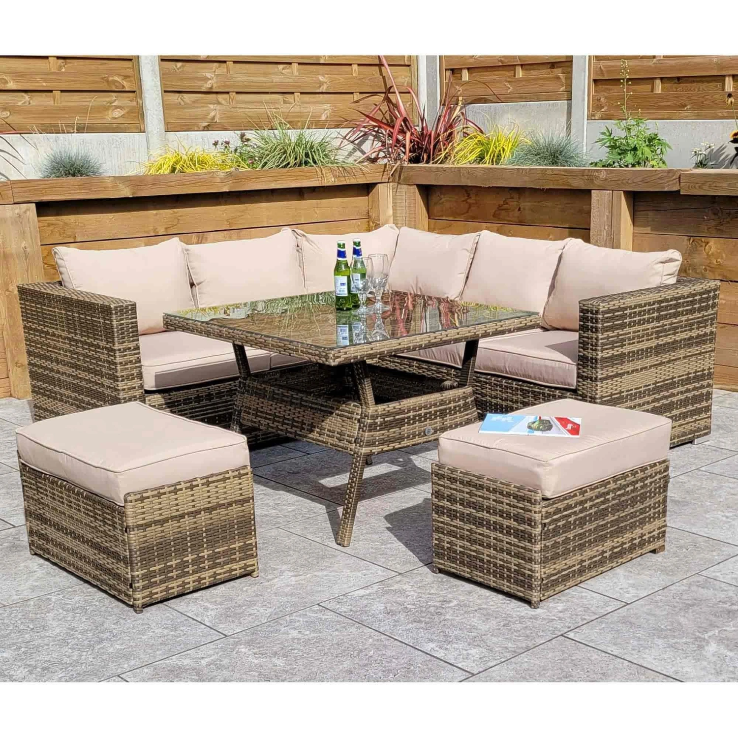 The Georgia Brown Rattan Compact Corner Sofa Dining Set with 2 Benches would be the perfect addition to the home when having friends and family over for parties and special occasions. More than enough seating and complete with a glass top table to place drinks on. Cushions should be stored in a dry area when not in use and the table should be covered in extreme hit.