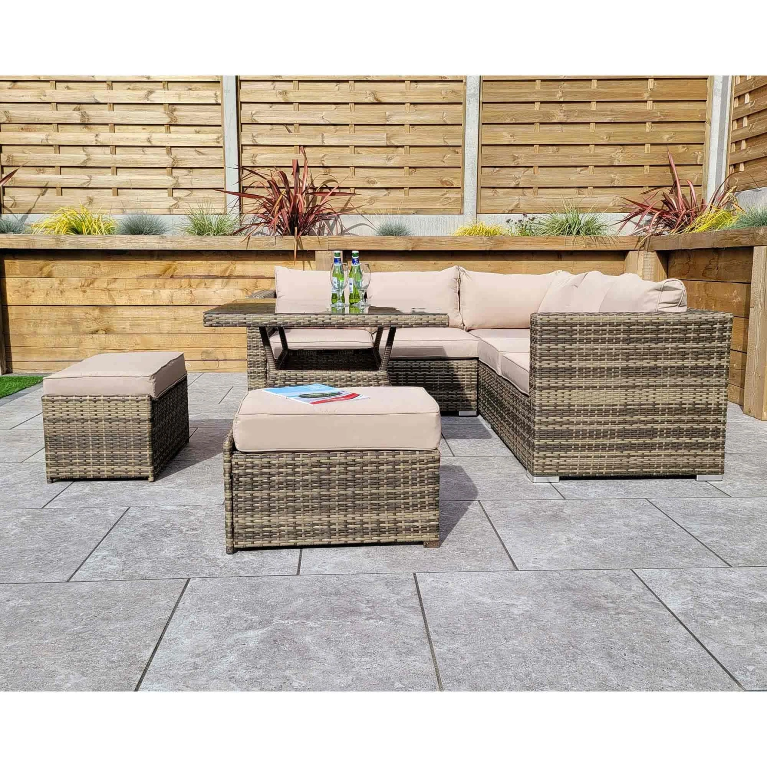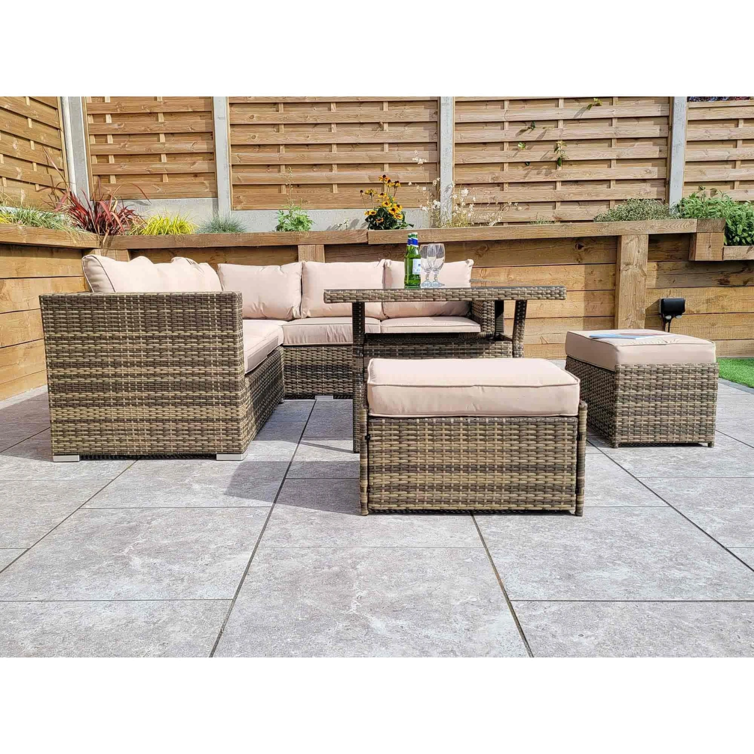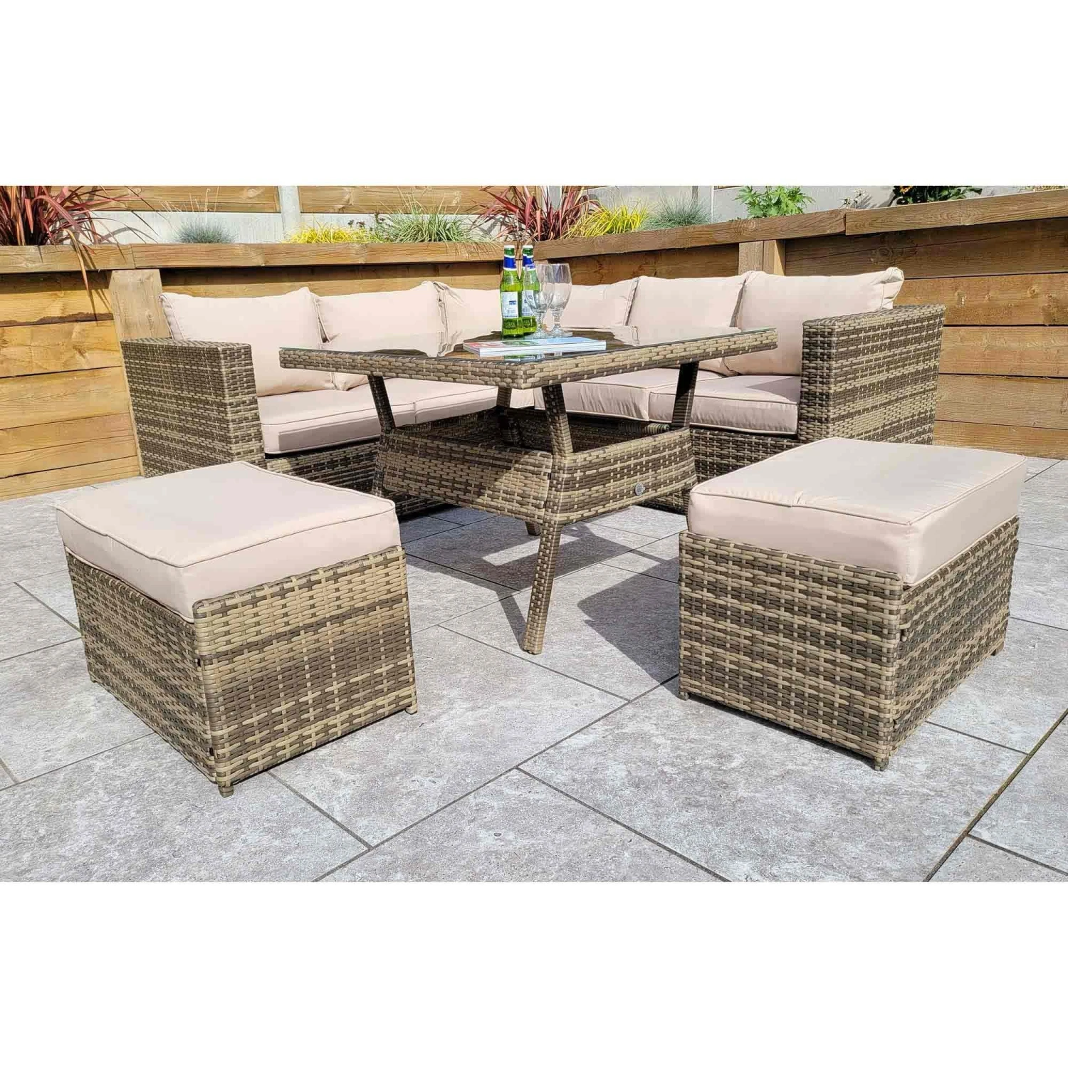 The Georgia Brown Rattan Compact Corner Sofa Dining Set with 2 Benches would be the perfect addition to the home when having friends and family over for parties and special occasions. More than enough seating and complete with a glass top table to place drinks on. Cushions should be stored in a dry area when not in use and the table should be covered in extreme hit.