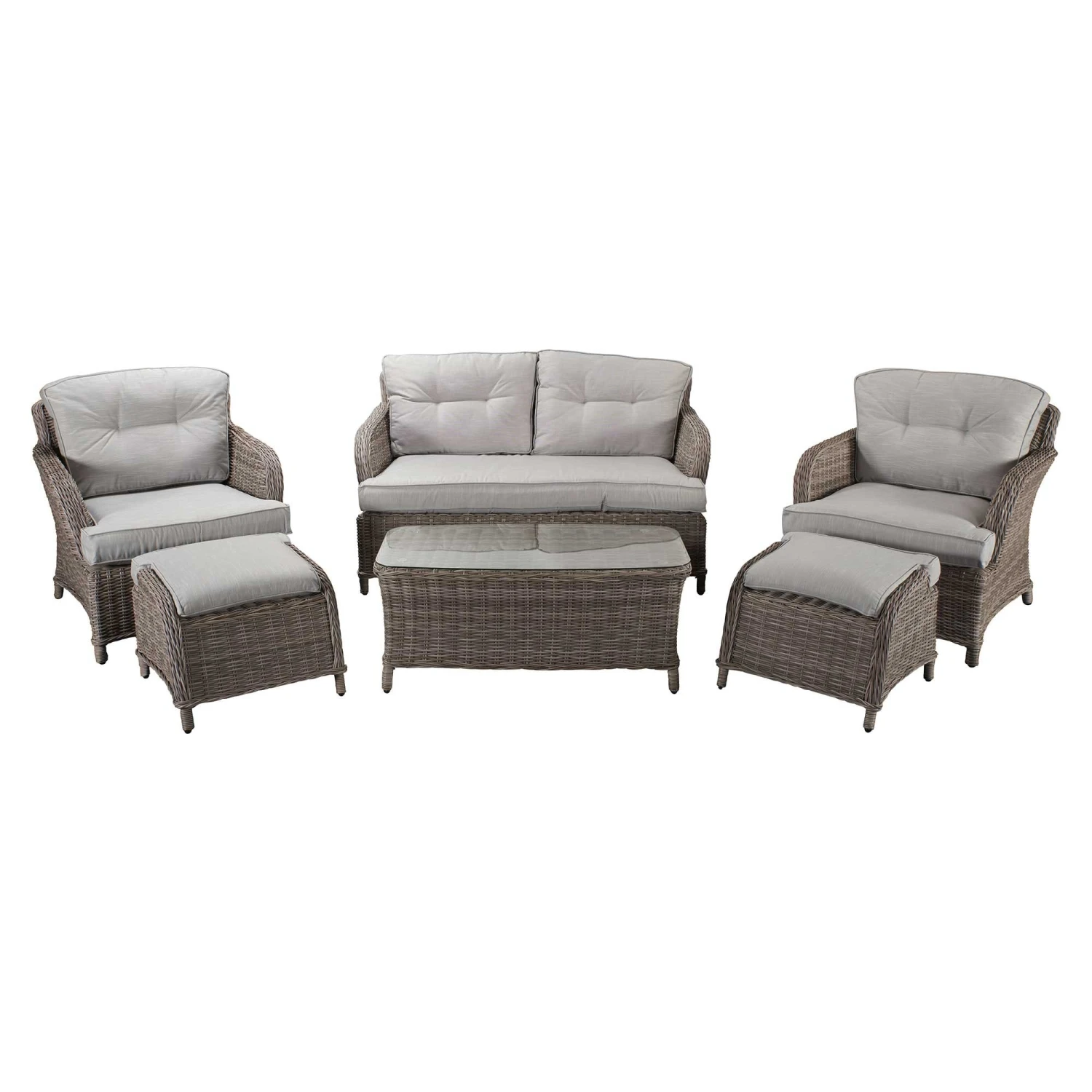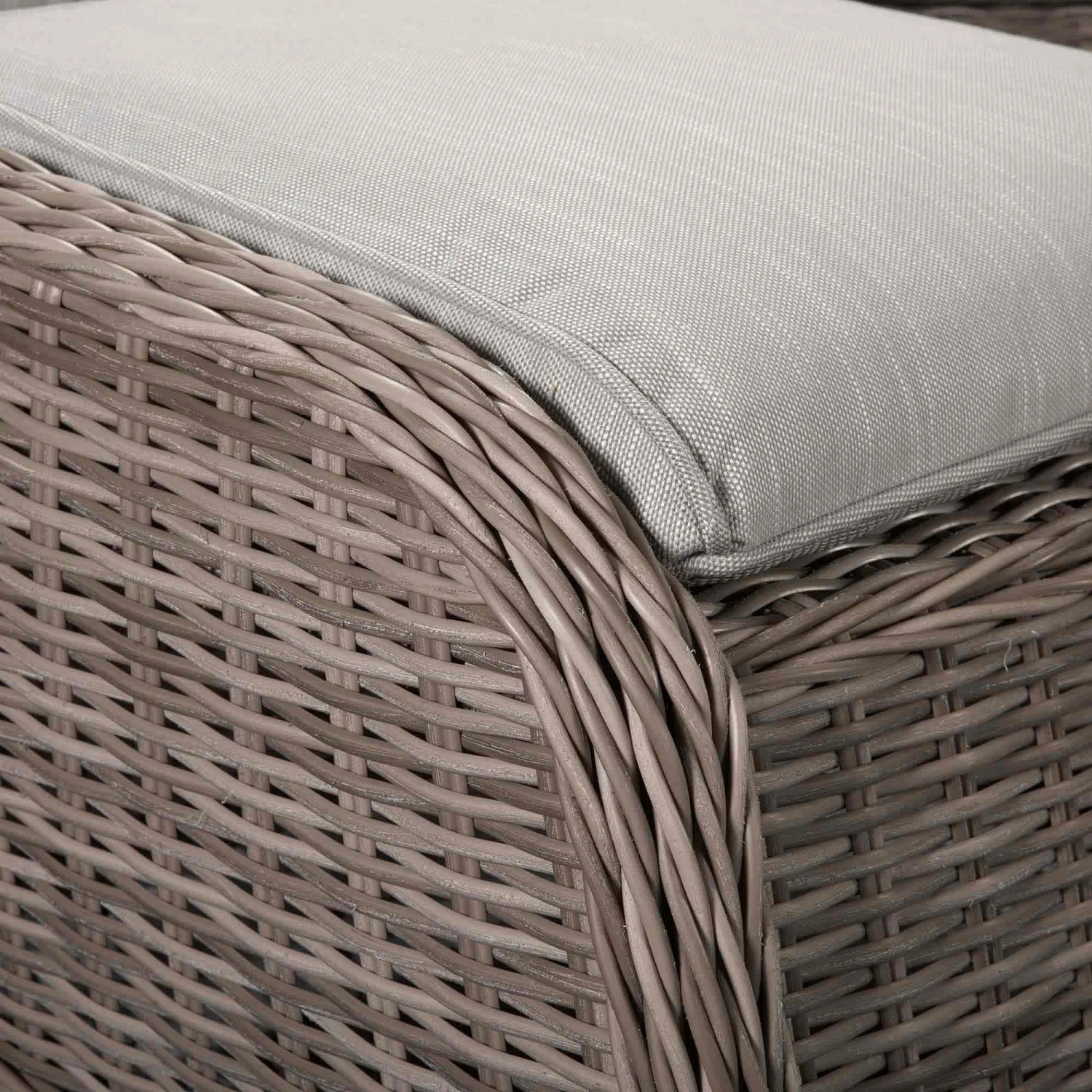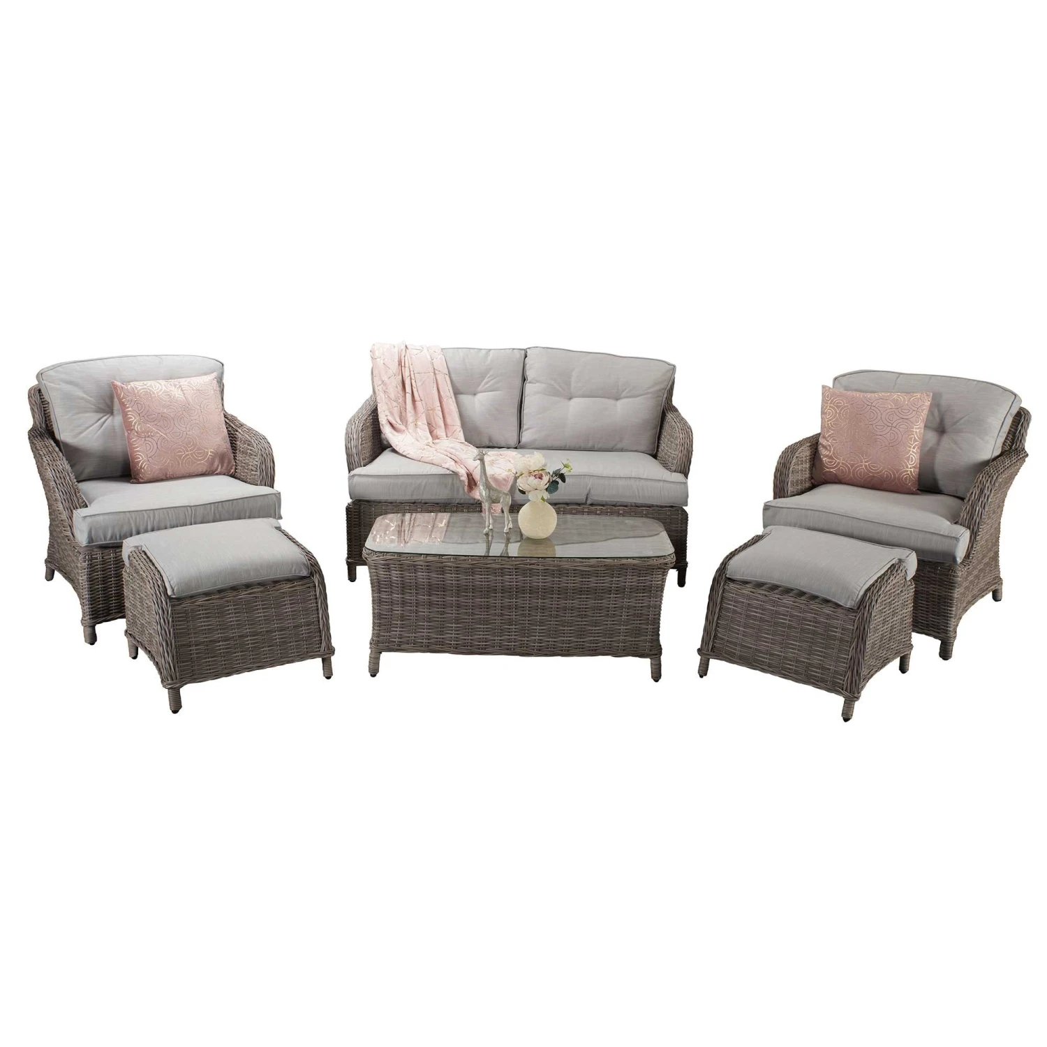 The Harriet Grey Rattan 4 Seater Sofa Set would be a great way to get the family round for barbeques featuring a luxurious garden sofa 2 chairs complete with footstools and a glass surface table for resting drinks on. Cushions should be kept in a dry area when not in use and the glass table should be covered in extreme heat.