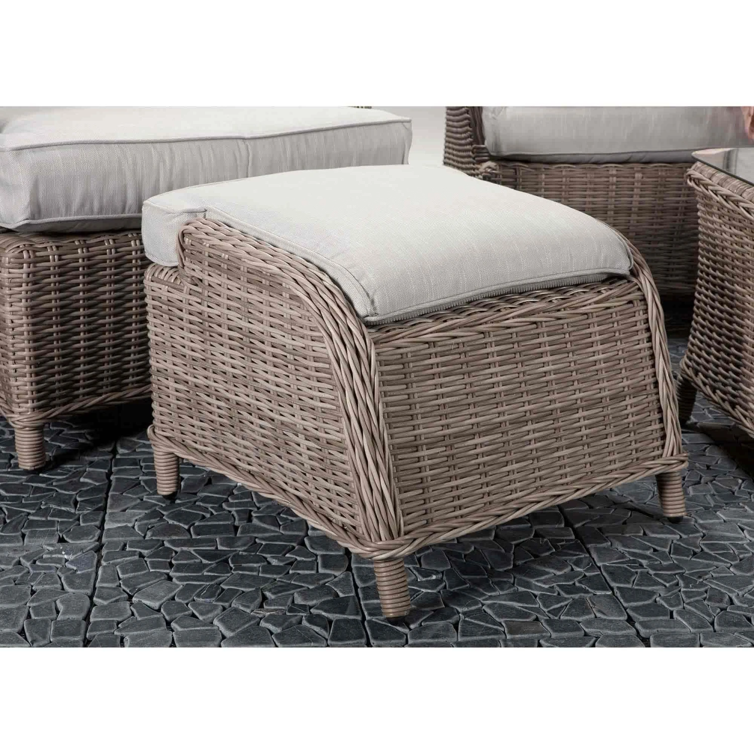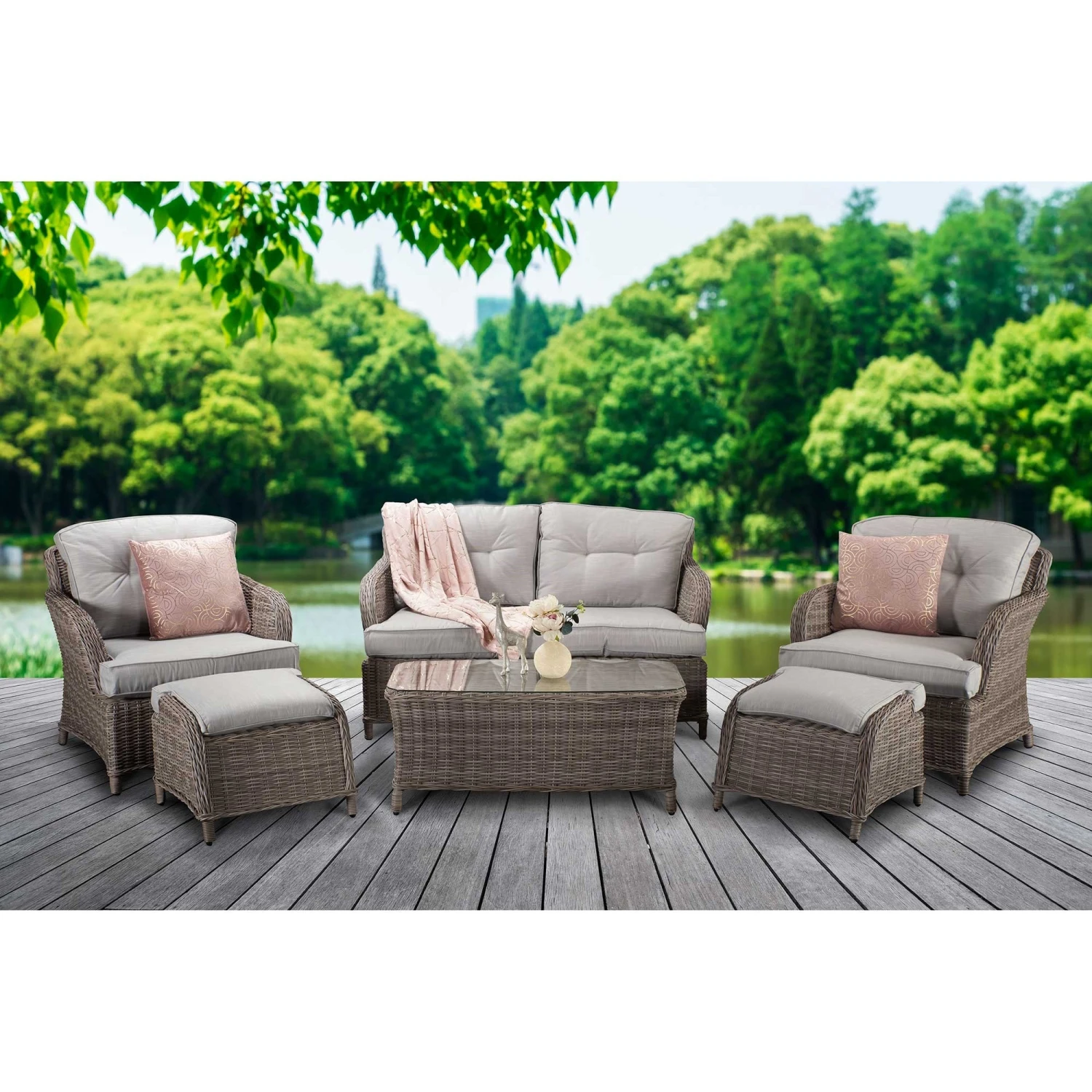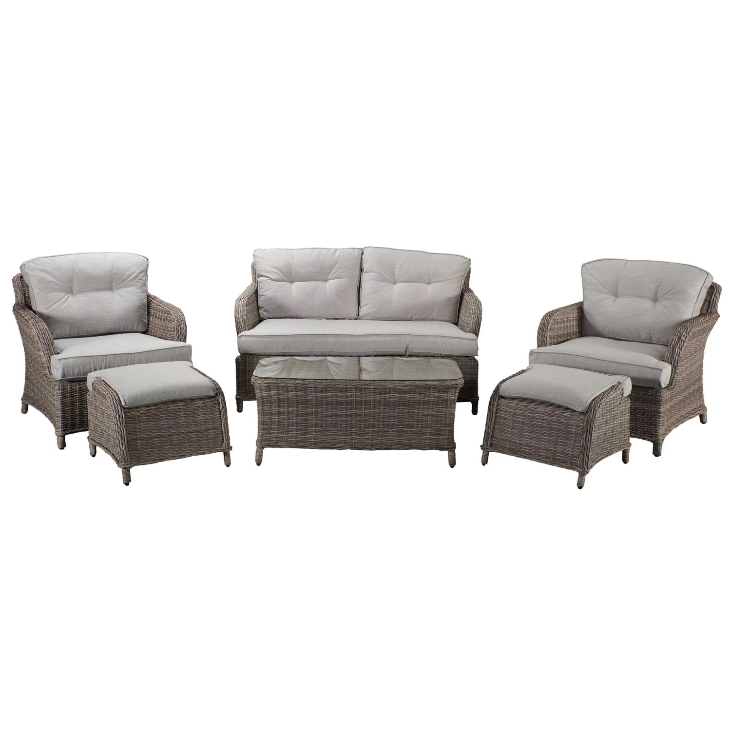 The Harriet Grey Rattan 4 Seater Sofa Set would be a great way to get the family round for barbeques featuring a luxurious garden sofa 2 chairs complete with footstools and a glass surface table for resting drinks on. Cushions should be kept in a dry area when not in use and the glass table should be covered in extreme heat.