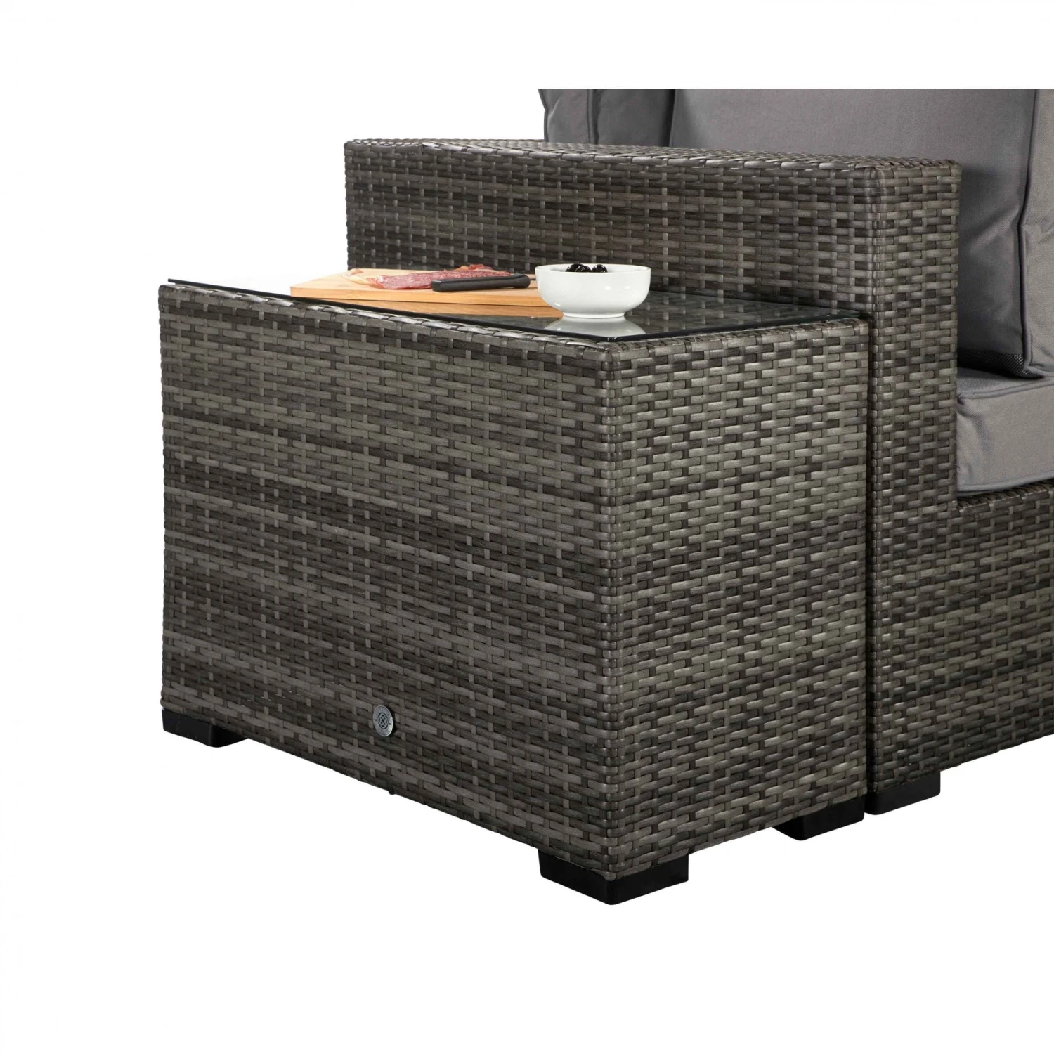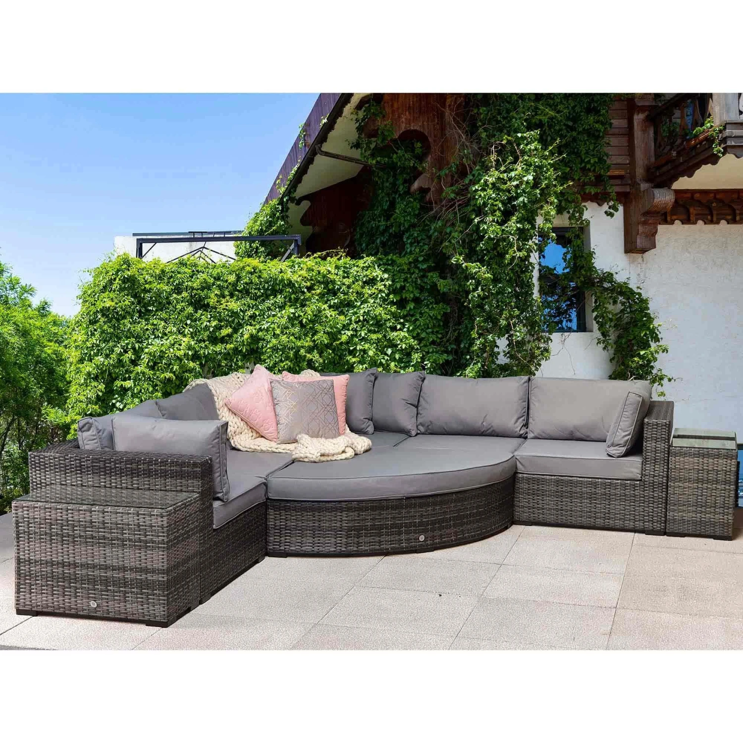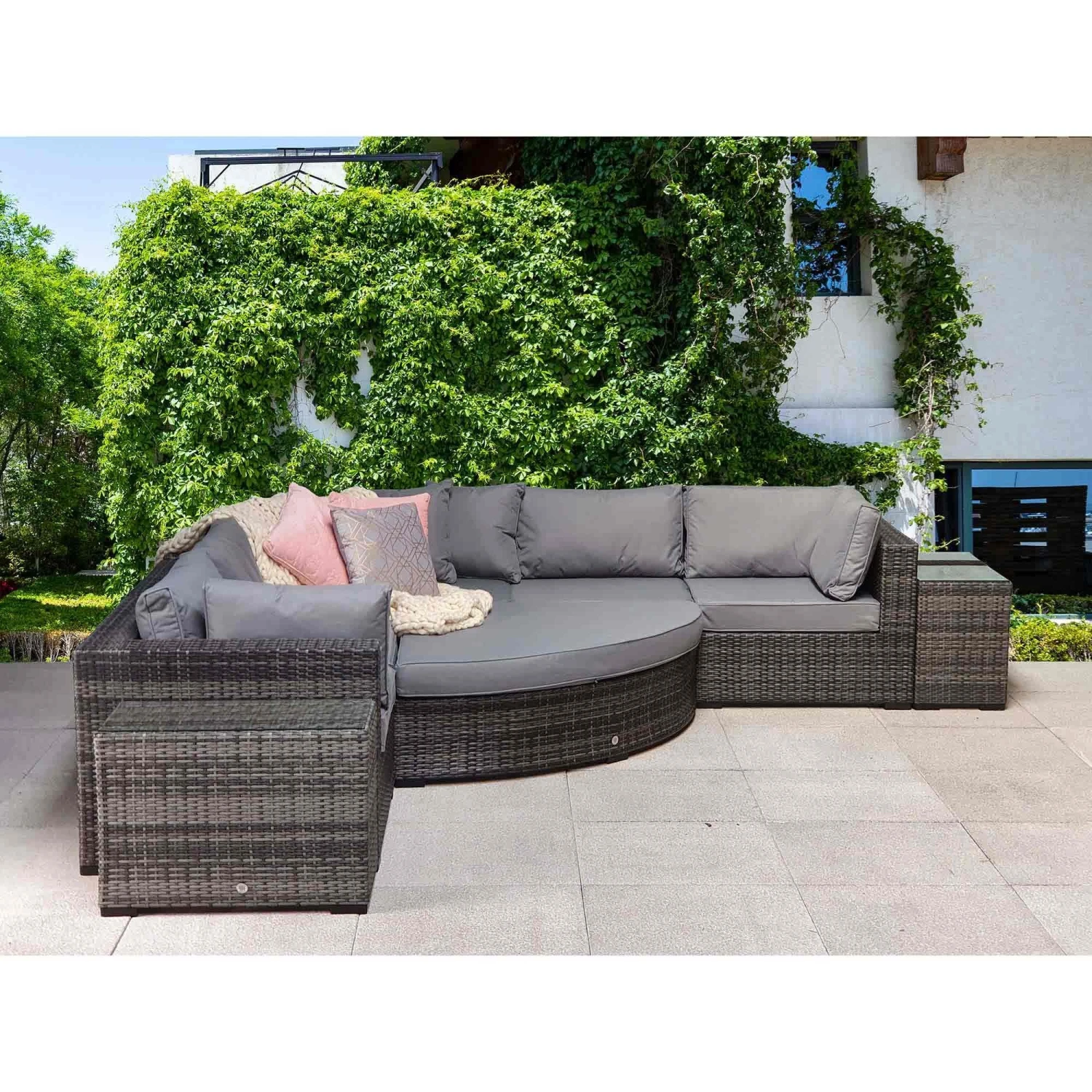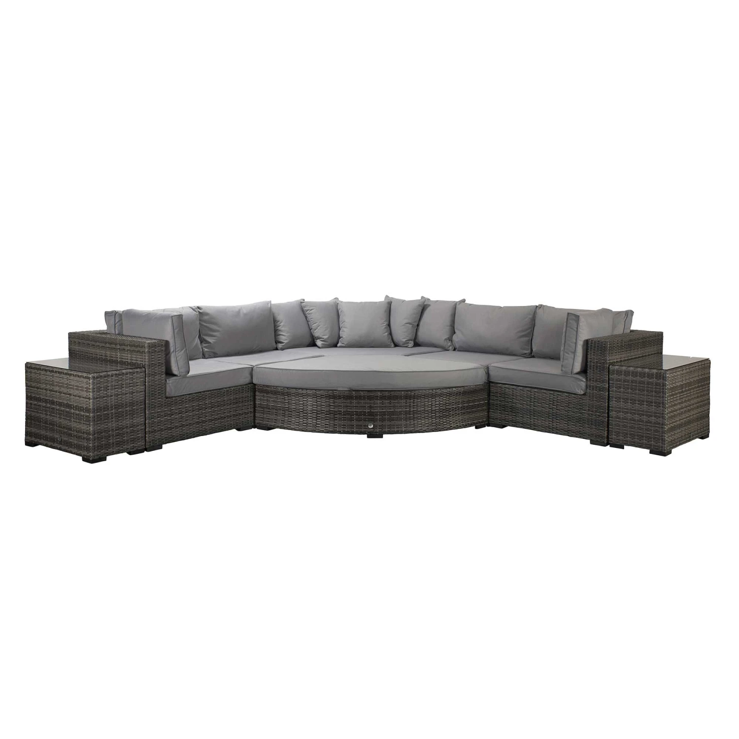 The Jessica Grey Rattan Large Corner Sofa set is sure to spruce up the garden with enough seating to have all the family and friends over for social occasions, celebrations and parties. This could even be impressive for a solo lie in the sun with end tables included to rest drinks on. The scatter cushions should be put in a dry place when not in use and glass tables should be covered in extreme heat.