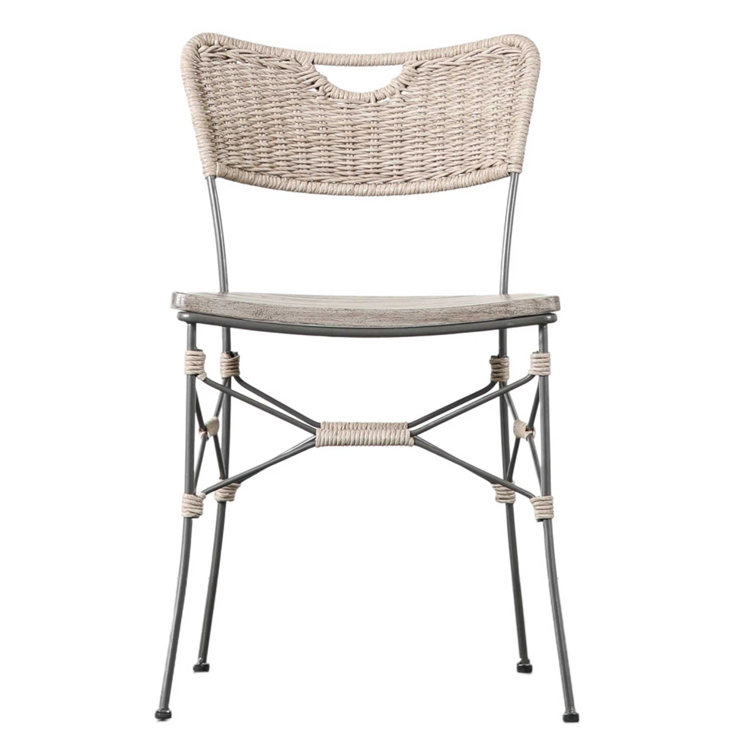 Pair this Rattan and Teak Seat Outdoor Dining Chair with any outdoor table to complete your outdoor dining set! This unusual dining chair is made from powder coated iron and features a stunning teak slat seat moulded for extra comfort. The dining chair showcases an all weather rattan weave back to complete the look.