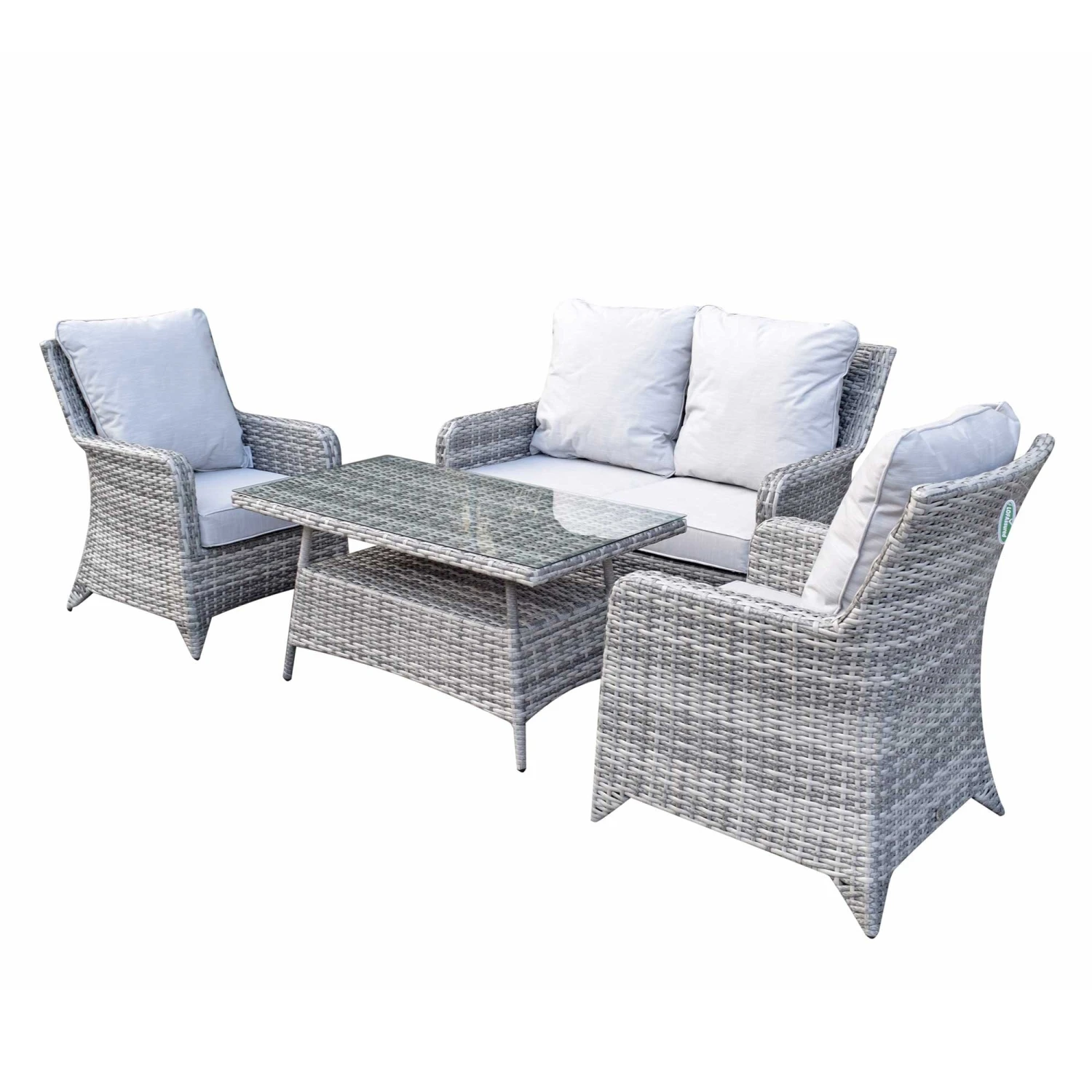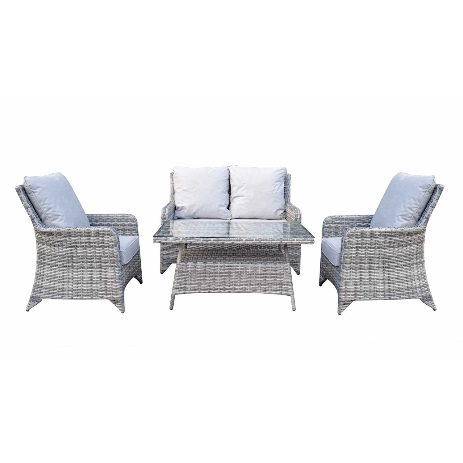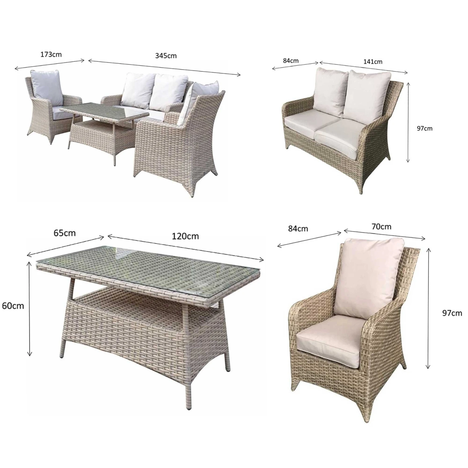 The Sarah Natural Rattan 4 Seater Sofa Set would be an ideal place to sit in the sun and relax in the summer months. There’s even enough seating for friends and family to visit and serve food and drinks on the high coffee table. Made from a strong aluminium frame with natural rattan. Scatter cushions should be kept in a dry area when not in use and the coffee table should be covered in extreme heat.