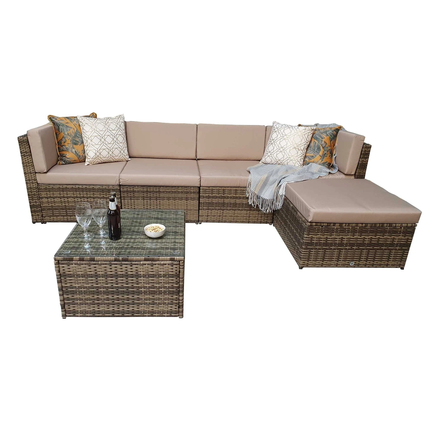The Stella Natural Brown Rattan Modular Corner Sofa is sure to spruce up the garden with somewhere relaxing to sit. Lounging in the sun reading a good book or there’s is more than enough room for the whole family to get together for special occasions and celebrations with the glass coffee table as a place to store food & drink. Cushions should be put stored in a dry area when not in use and the glass table should be covered in extreme heat.